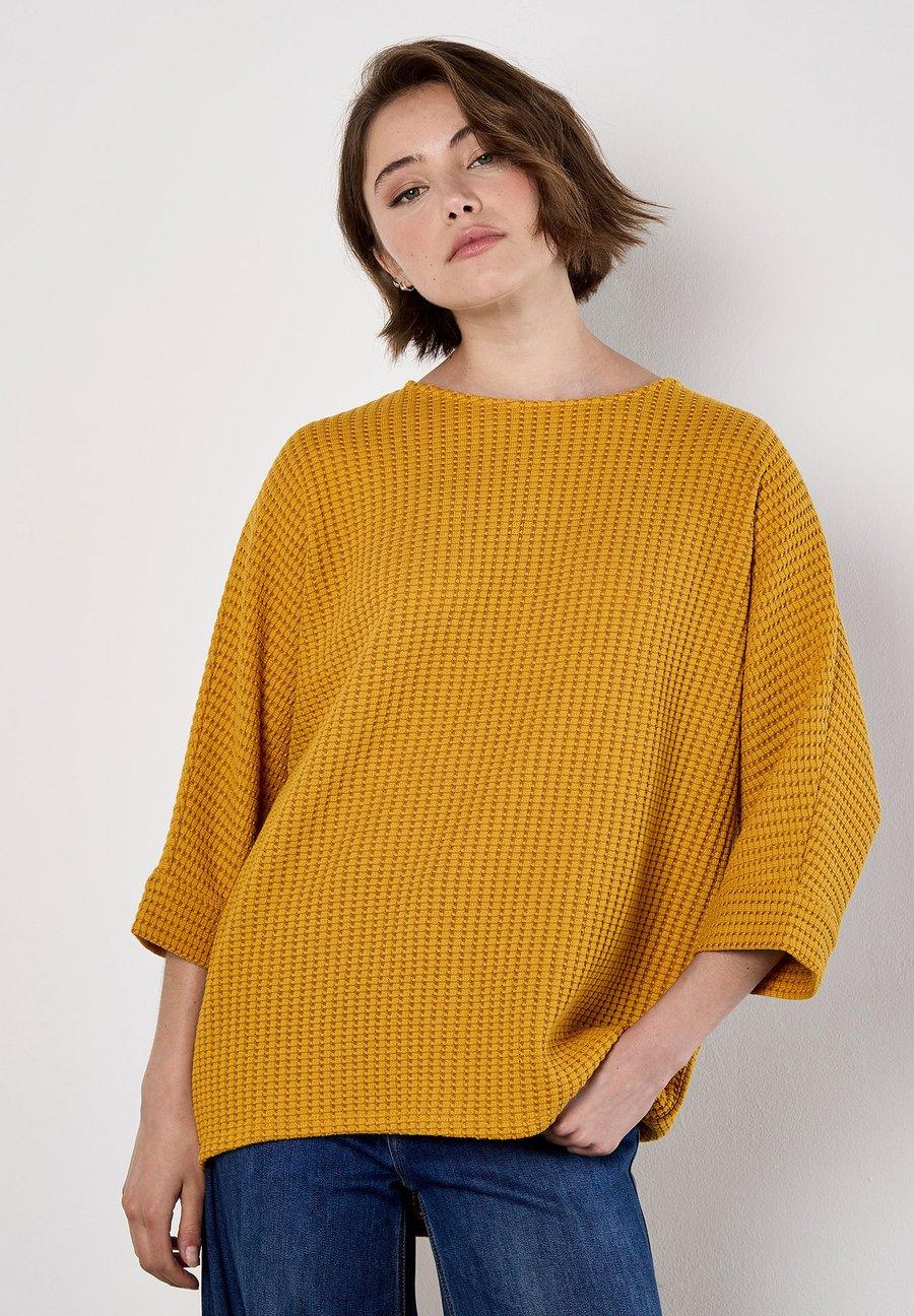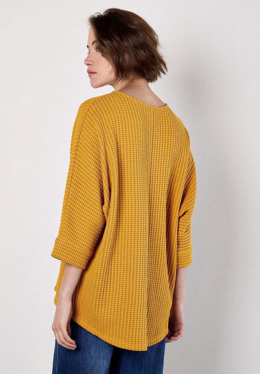 Создайте свой гардероб для выходных с помощью этой повседневной блузки. Изготовленная из трикотажа средней плотности с вафельной текстурой, эта модель имеет укороченные рукава летучая мышь, круглый вырез и свободный крой. Вырез горловины: лодочкаМатериал и уход