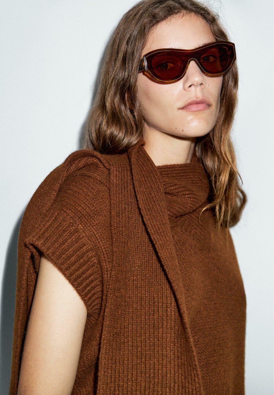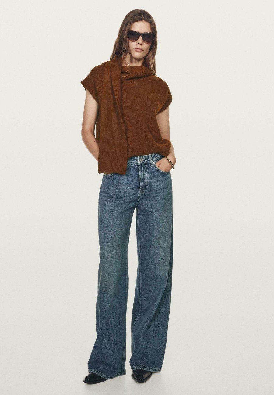 Жилет из 100% шерстяной ткани. V-образный вырез. Деталь в виде шарфа на шее. Ребристая отделка. Со встроенным съемным шарфом. Воротник: Шаль.Материал и уход