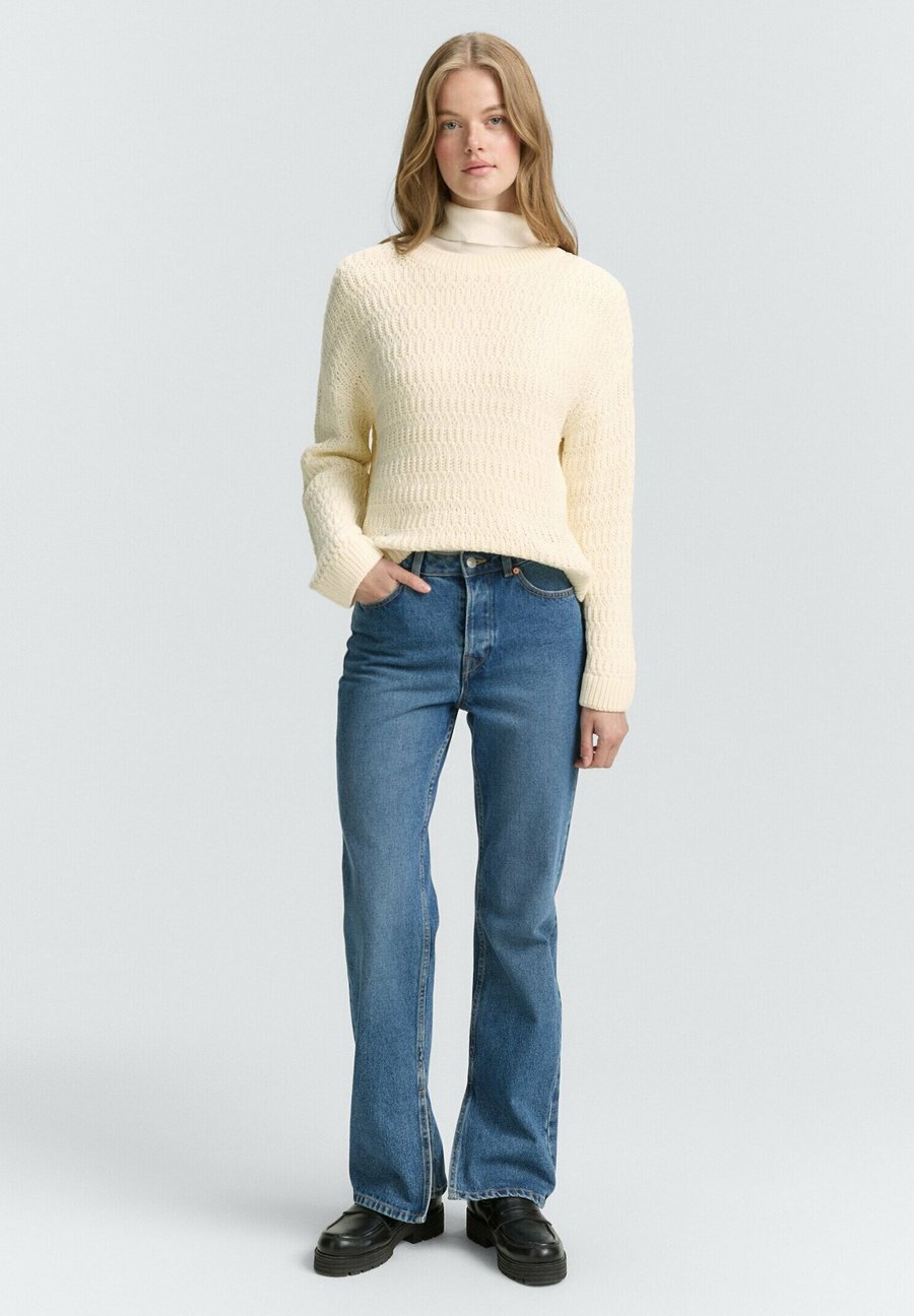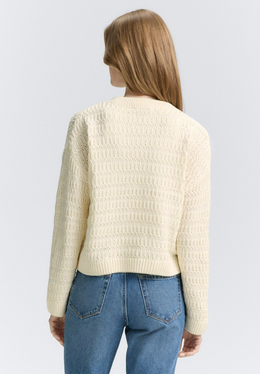 Структурированный свитер с ребристыми манжетами по низу и слегка заниженным плечевым швом для свободного кроя. Вырез горловины: круглый.Материал и уход