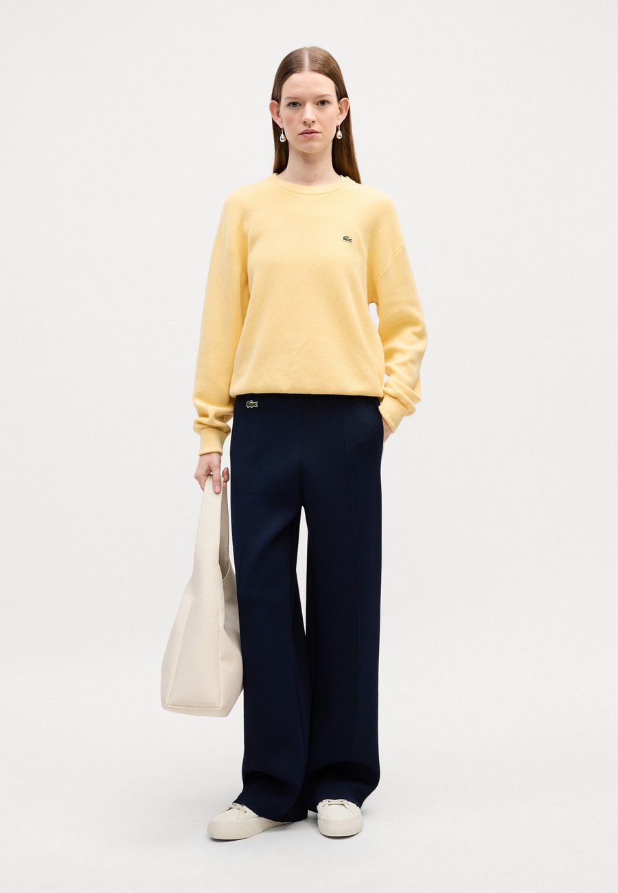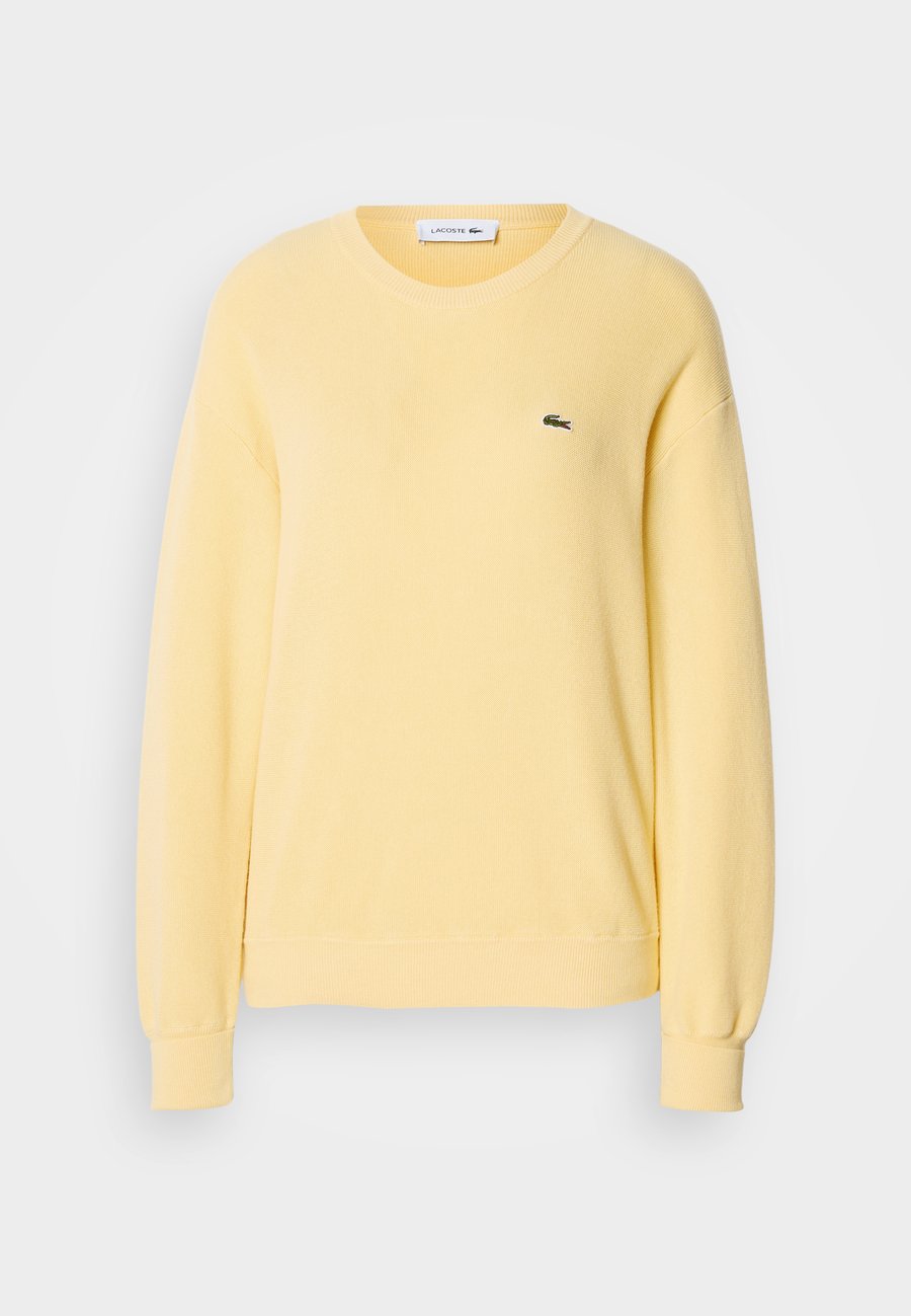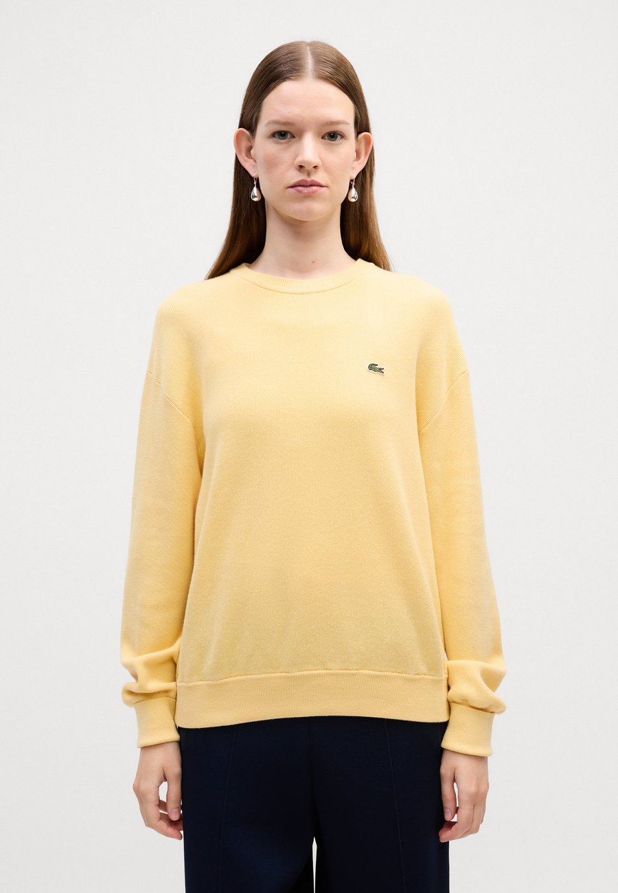 Свитер свободного кроя, связанный узором мох, из смеси хлопка и шерсти для мягкости. Украшен вышитым крокодилом и контрастной отделкой. Вырез горловины: круглый.Материал и уход