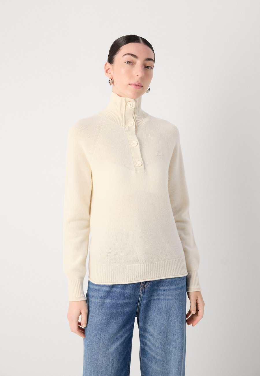 Элегантный свитер из чесаной шерсти с 3D-технологией вязки, высоким воротником на пуговицах и подвернутыми деталями для создания женственного силуэта. Вырез: КруглыйМатериал и уход