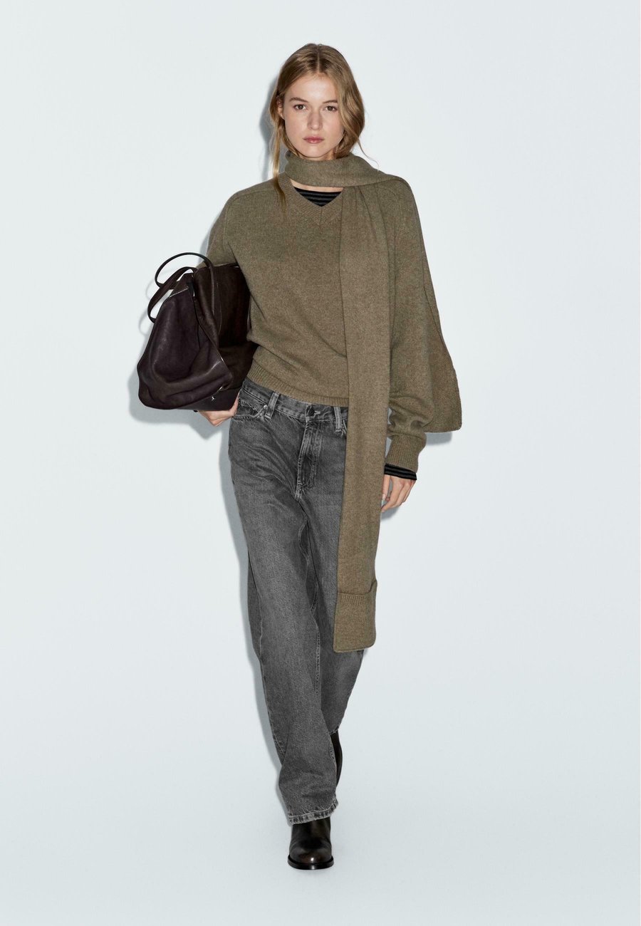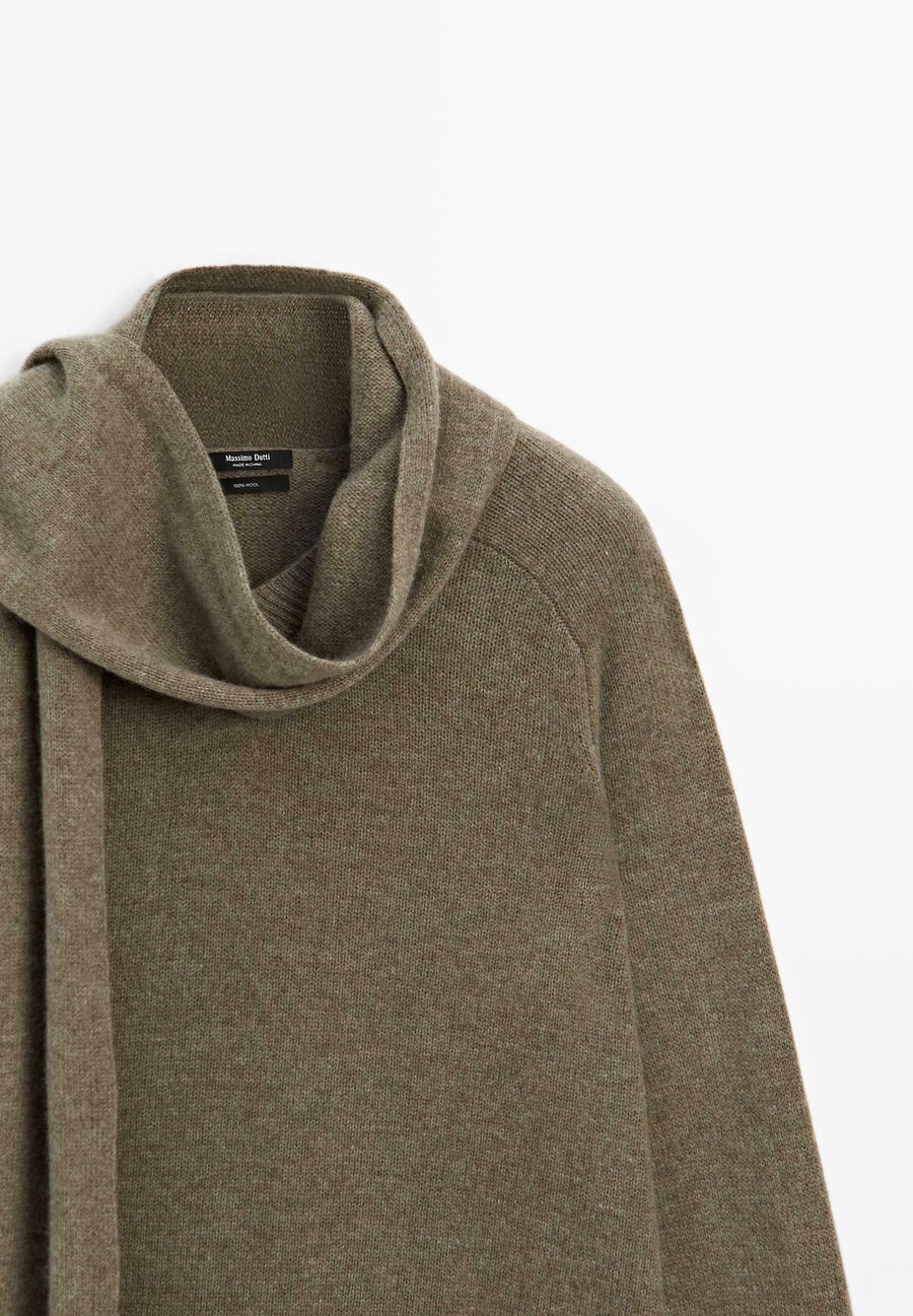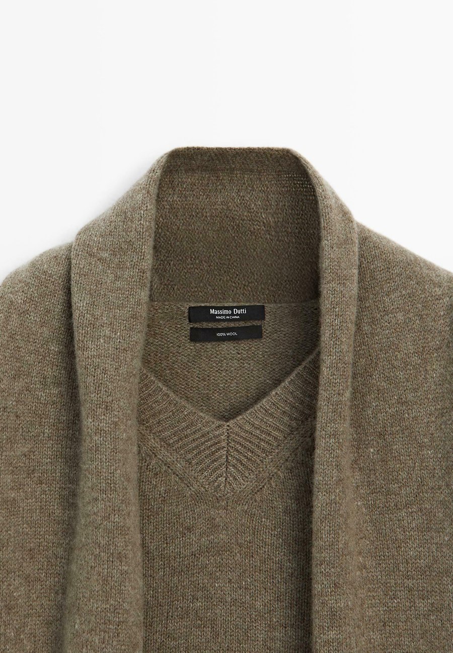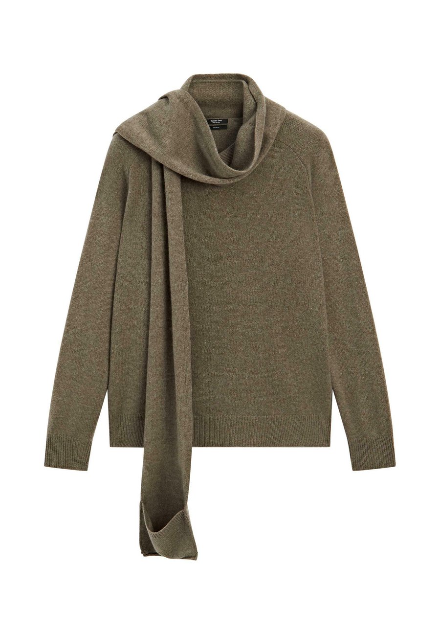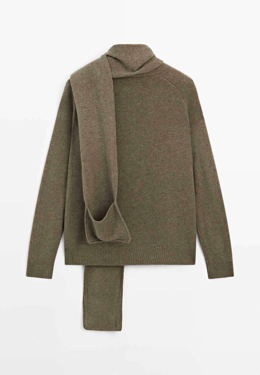 Широкий и свободный силуэт, не приталенный. V-образный вырез. Свитер из 100% шерсти. Ребристая отделка. Рукав реглан. Встроенный съемный шарф. Воротник: ШальМатериал и уход