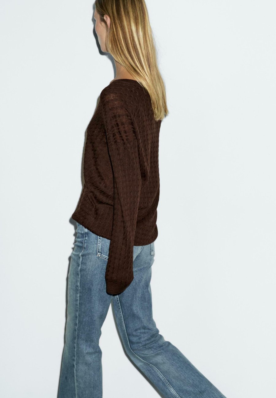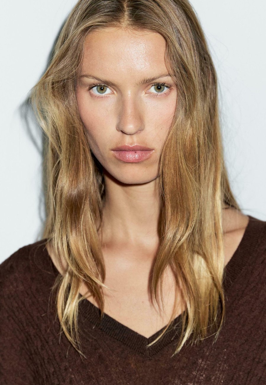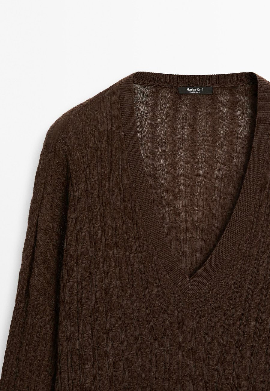 V-образный вырез. Ребристая отделка. Длинные рукава. Вязаный свитер из смесовой шерстяной ткани. Детали с плетением. Вырез горловины: Низкий V-образный вырезМатериал и уход