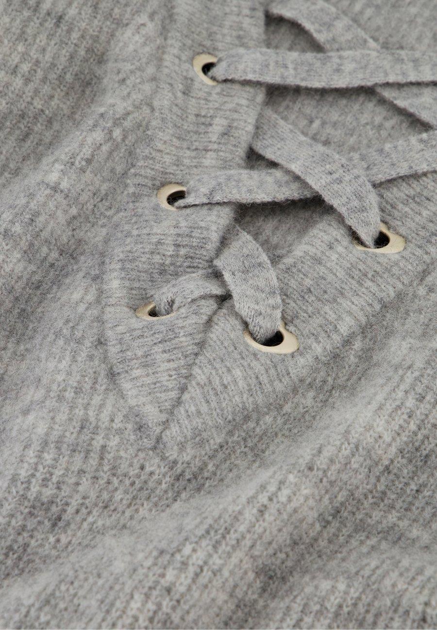 Этот пуловер серого меланжевого цвета выделяется шнуровкой на воротнике и свободным силуэтом, представляя собой современную интерпретацию уютной классики. Насыщенный оттенок и удобный крой делают это платье универсальным вариантом для повседневной носки, от спокойных моментов дома до непринужденных прогулок по городу. Вырез горловины: Низкий V-образный вырезМатериал и уход