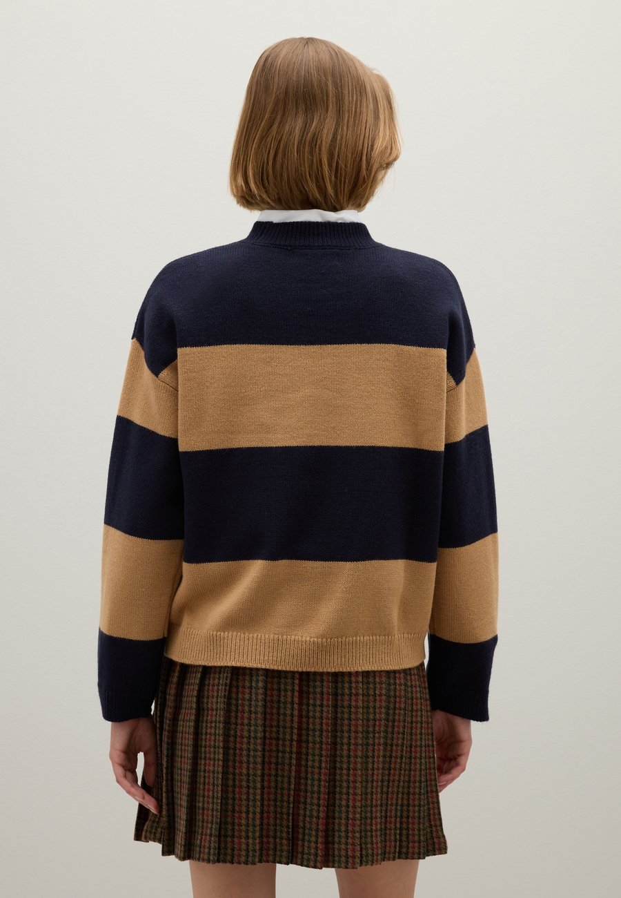 Сине-коричневый полосатый джемпер из линии PIOMBO - идеальная одежда для холодных дней. Стандартный крой и трикотажная ткань обеспечивают комфорт и свободу движений. Круглый вырез горловины делает этот джемпер универсальным, подходящим как для повседневных образов с джинсами, так и для более изысканных стилей с юбками. Полосатый дизайн добавит яркости вашему гардеробу. Вырез горловины: КруглыйМатериал и уход