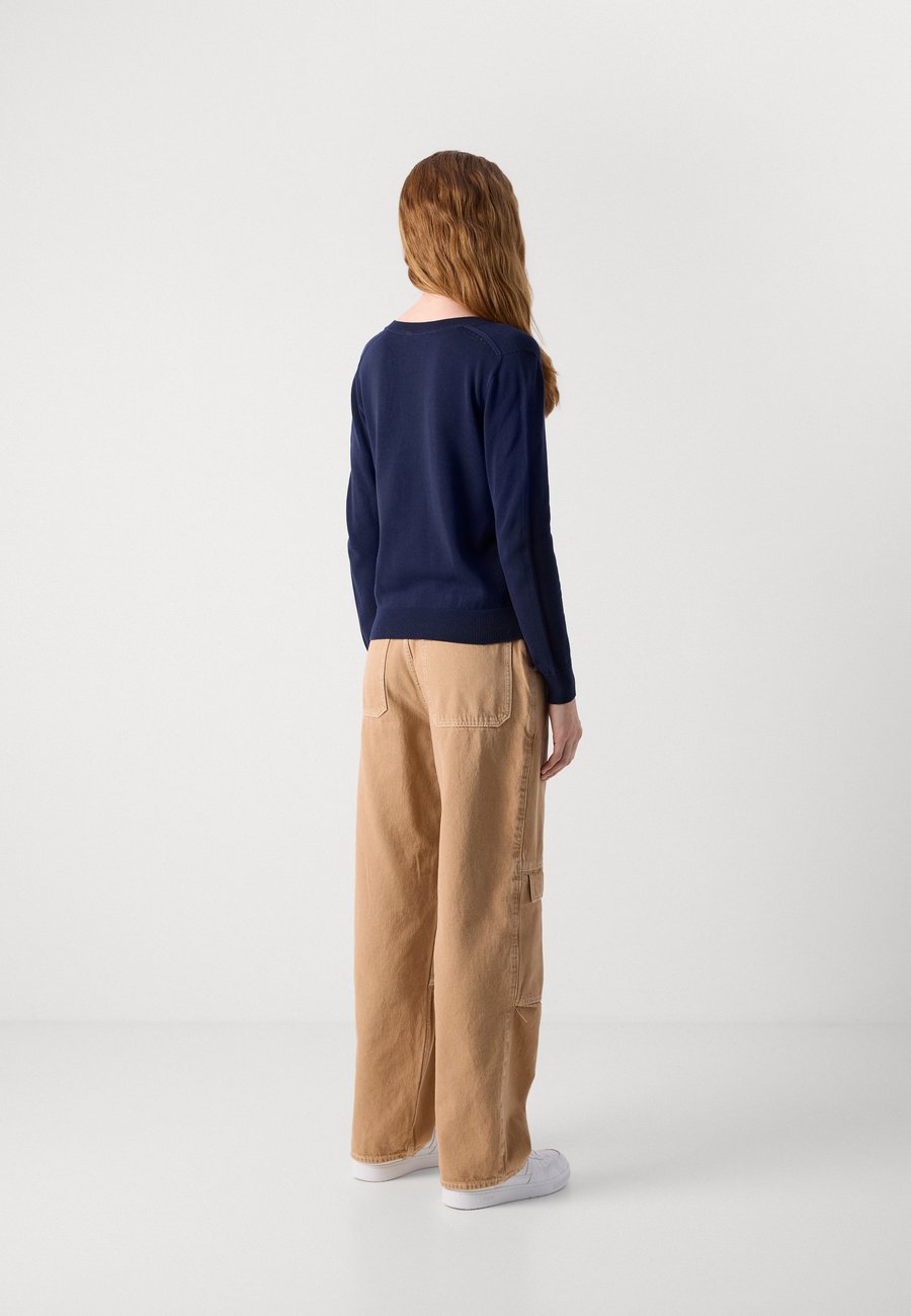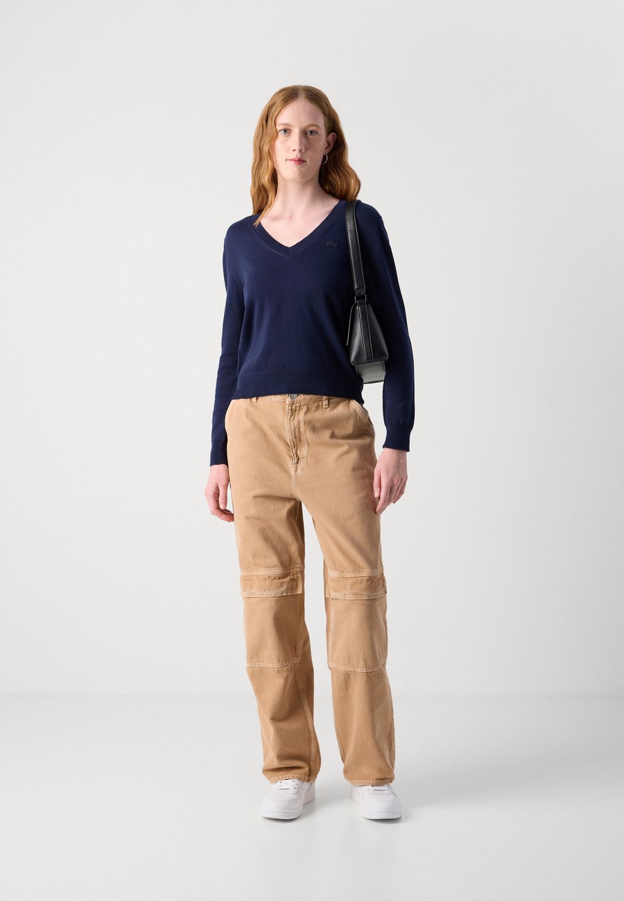 Свитер с V-образным вырезом, изготовленный с использованием технологии 3D-вязания для бесшовной посадки. Кружевные женственные детали, ребристые акценты. Вневременная элегантность. Вырез: Низкий V-образный вырезМатериал и уход