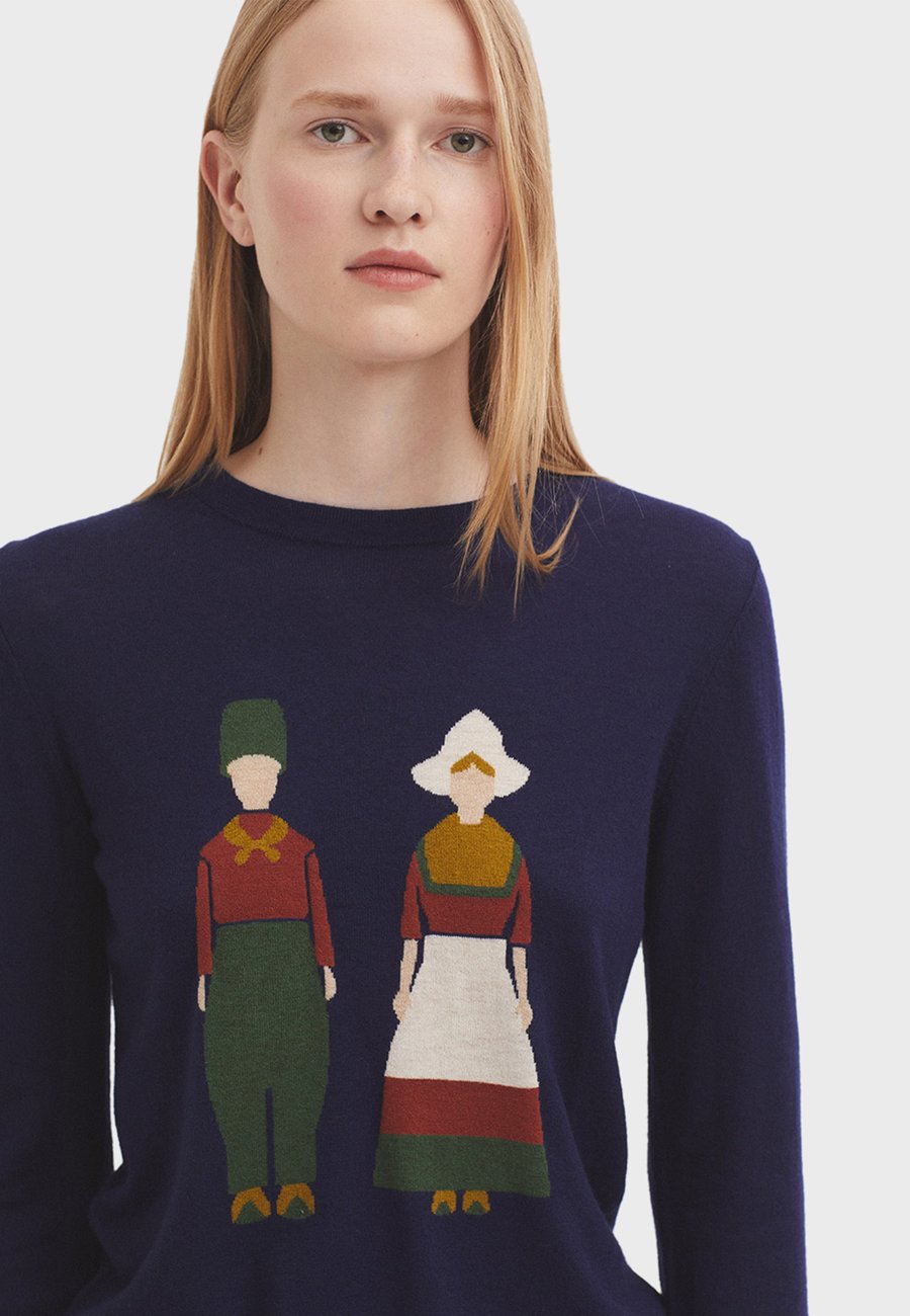 Свитер прямого кроя из тонкой трикотажной шерсти мериноса с добавлением кашемира. Круглый вырез, длинные рукава. В центре - интарсия с изображением голландской пары в традиционных костюмах. Ребристая отделка по линии горловины, манжетам и низу. Очаровательная вещь, сочетающая фольклорный дух с графическим рисунком. Вырез горловины: круглыйМатериал и уход