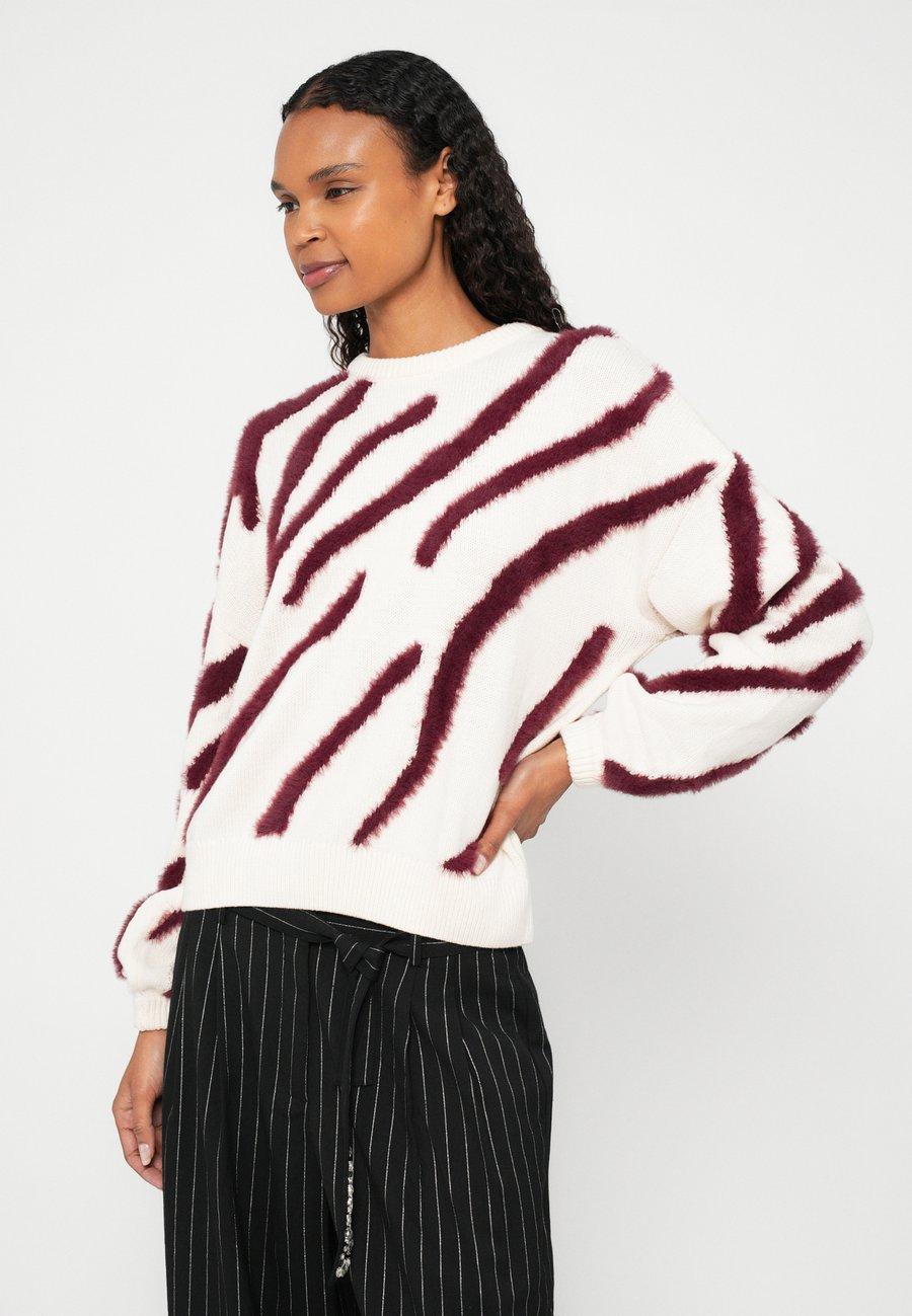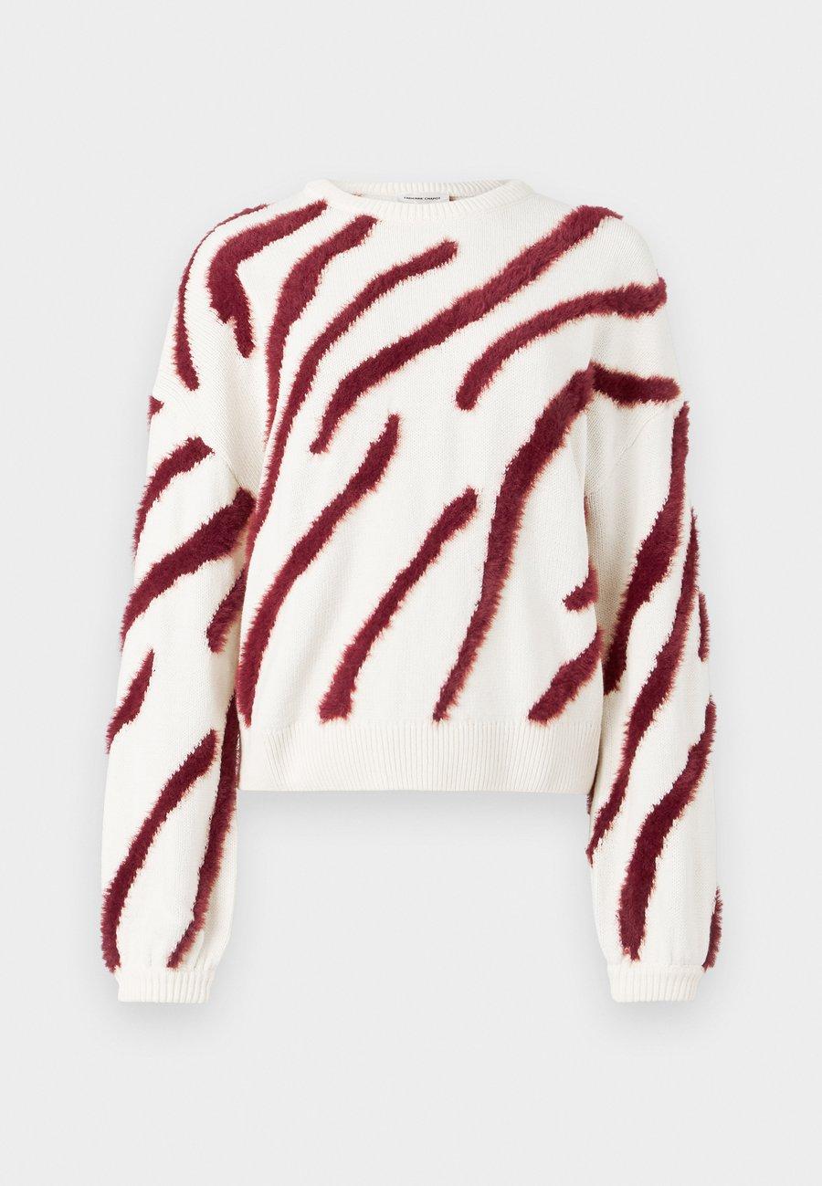 Этот уютный белый пуловер украшен смелым бордовым узором на мягком, фактурном трикотаже, что придает игривость вневременному силуэту. Благодаря своему эффектному дизайну, эта футболка идеально подходит для того, чтобы скрасить повседневные моменты, от расслабленных послеобеденных часов до непринужденных вечерних выходов. Вырез горловины: круглыйМатериал и уход