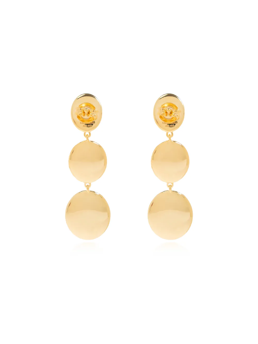 Серьги золотистого цвета с многоярусным дизайном из трёх спиральных дисков. Эти серьги идут в паре. При обычном ежедневном использовании и воздействии внешних факторов блеск драгоценных камней и золотых поверхностей может уменьшаться. Для ухода используйте специальные неабразивные средства, предназначенные для чистки ювелирных изделий.