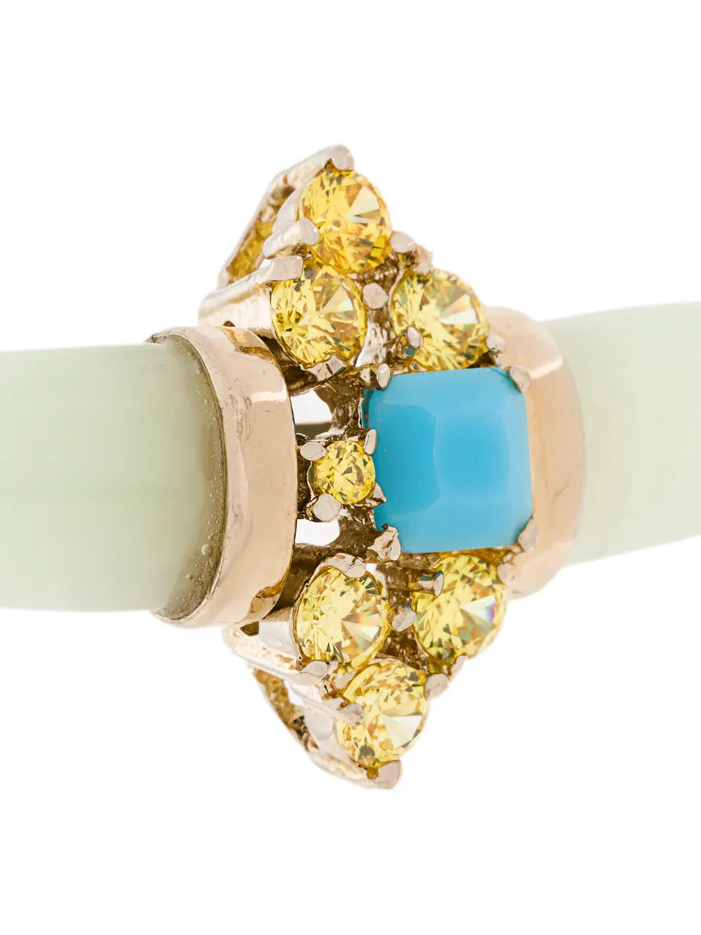Моносерьга 'Elegua' из позолоченной латуни с декором в форме рога от Iosselliani. Застежка-бабочка, квадратная бирюзовая вставка по центру, отделка желтым цирконием, декор в форме рога из нефрита с двух сторон.