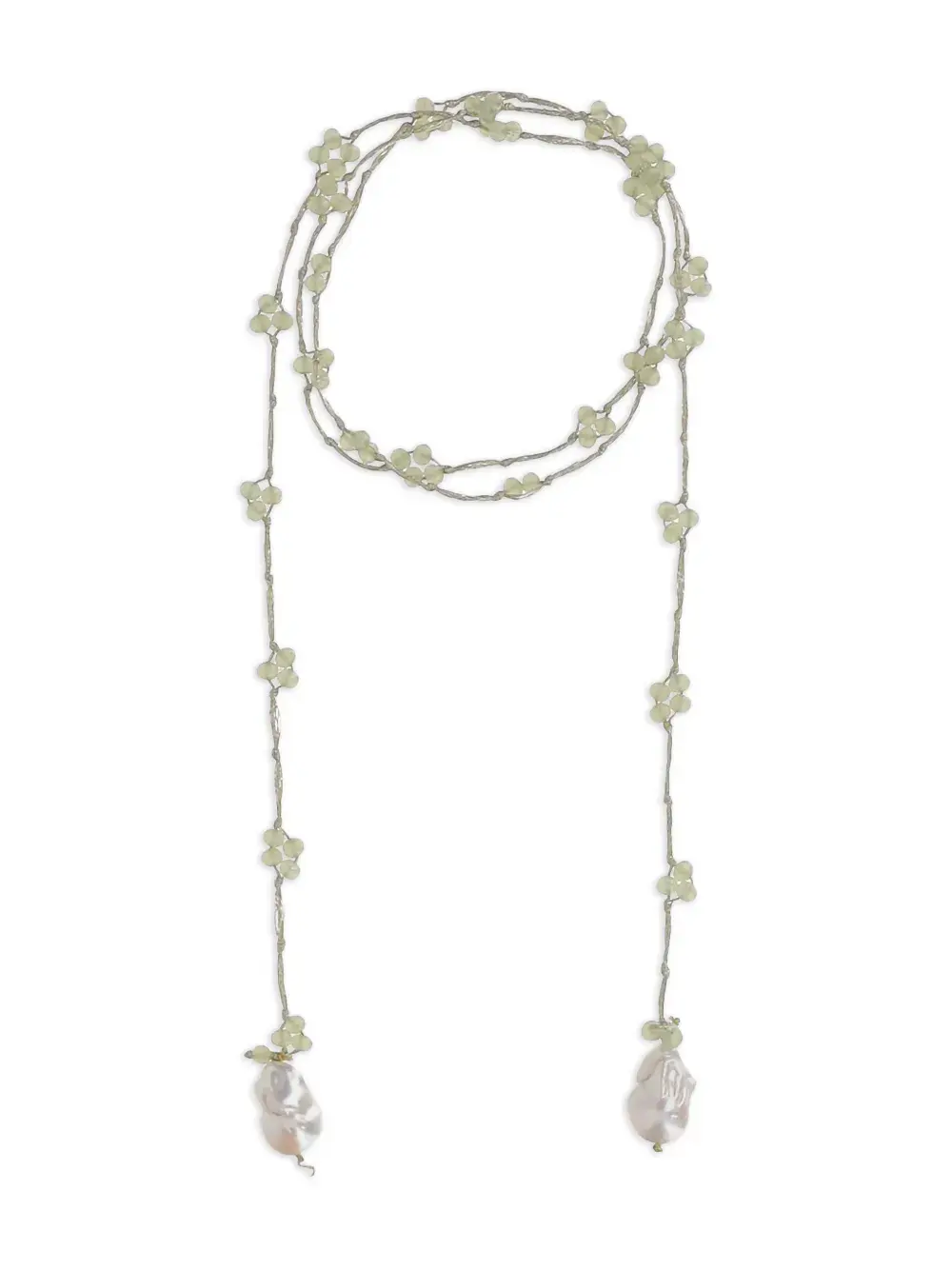 Зеленые жемчужины на концах, детали из бусин. Жемчуг должен быть последним, что вы надеваете утром, и первым, что снимаете вечером. Избегайте контакта с парфюмерией или кремами, очищайте просто мягкой тканью.