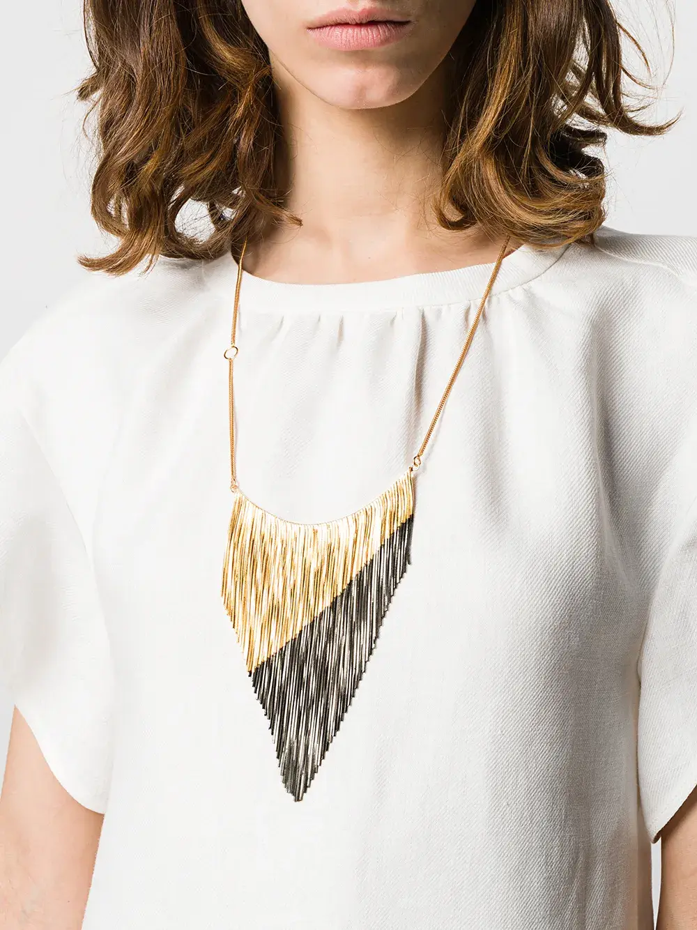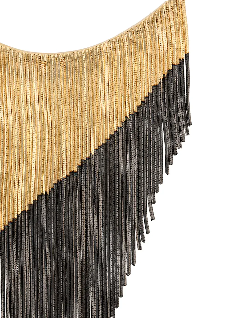 Детали с бахромой, тонально-градиентный эффект и застёжка-лобстер.