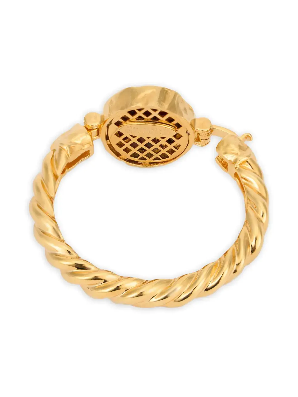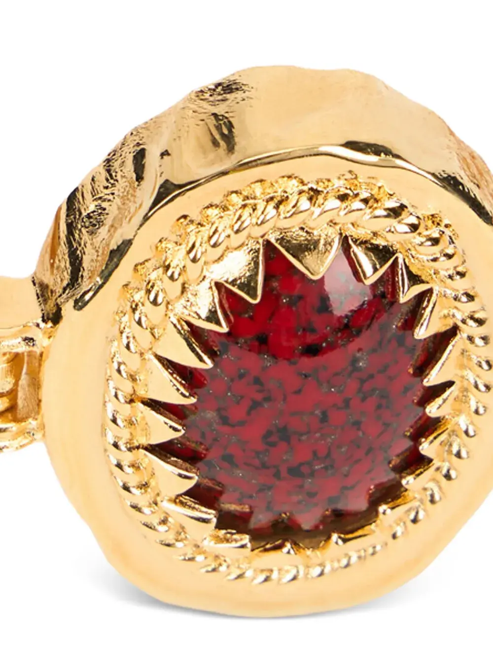 Подробнее о товаре: - золотистый - витое кольцо - рубины - круглые украшения - булавочная застежка - драгоценный металл - Повседневное использование и воздействие внешних факторов могут уменьшить блеск драгоценных камней и поверхностей, покрытых золотом. Для ухода используйте специальные неабразивные средства, предназначенные для чистки ювелирных изделий.