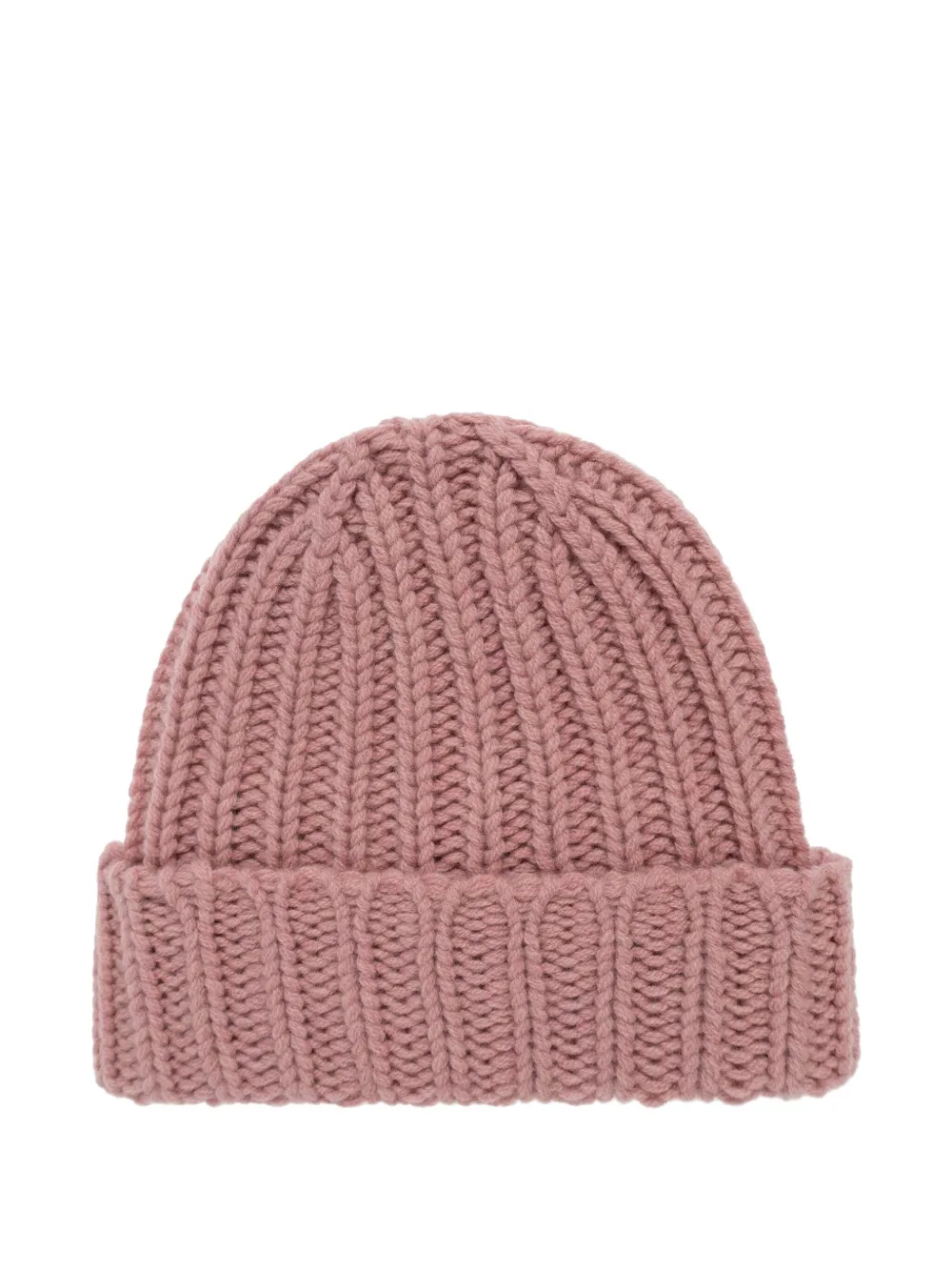 Светло-розовая вязаная шапка в рубчик с отворотом и декором в виде сердца