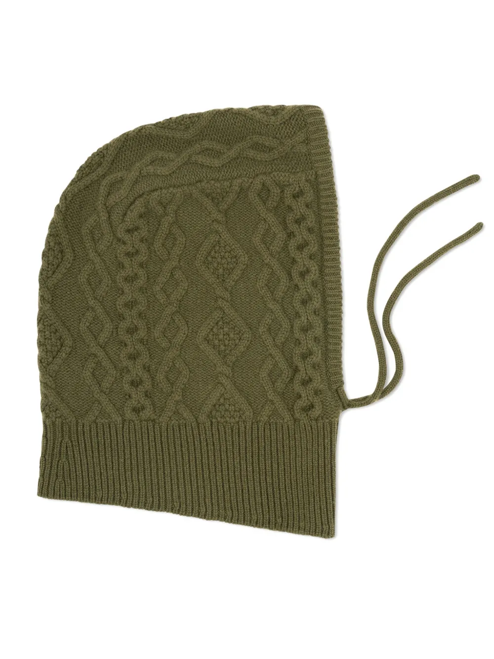 Оливково-зелёный вязаный узором кашемировый материал, шнурок-затяжка, ребристый край, фактурный узор
