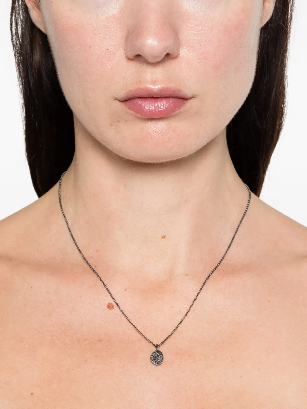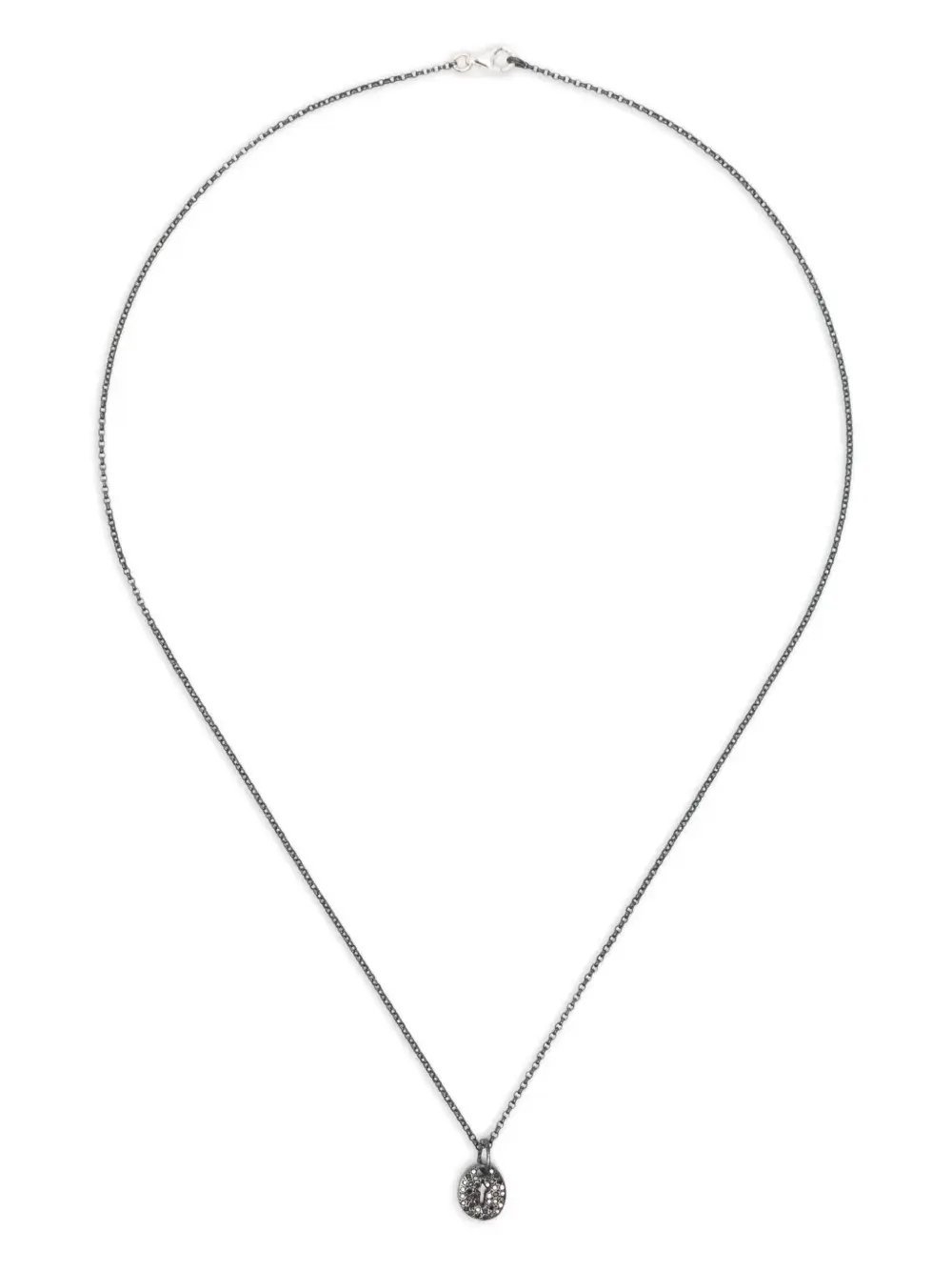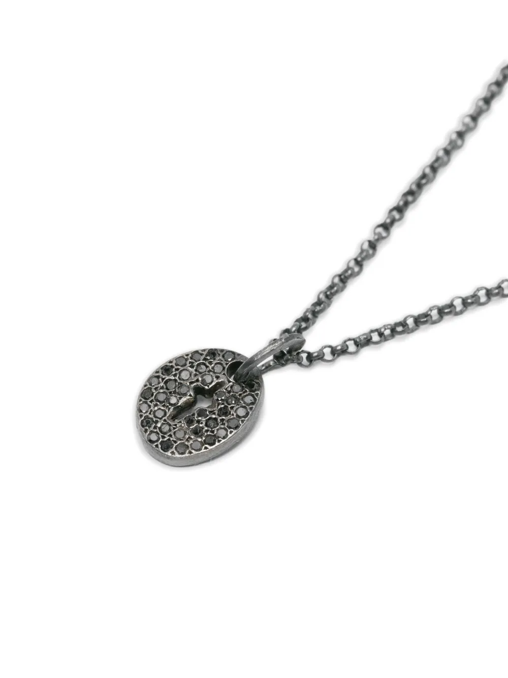 Подробнее о товаре: - серебристый - серебро 925 пробы - паве из черных бриллиантов круглой огранки - овальная подвеска - вырез в форме креста - застежка лобстер - Повседневное использование и воздействие внешних факторов могут уменьшить блеск драгоценных камней и поверхностей, покрытых золотом. Для ухода используйте специальные неабразивные средства, предназначенные для чистки ювелирных изделий.