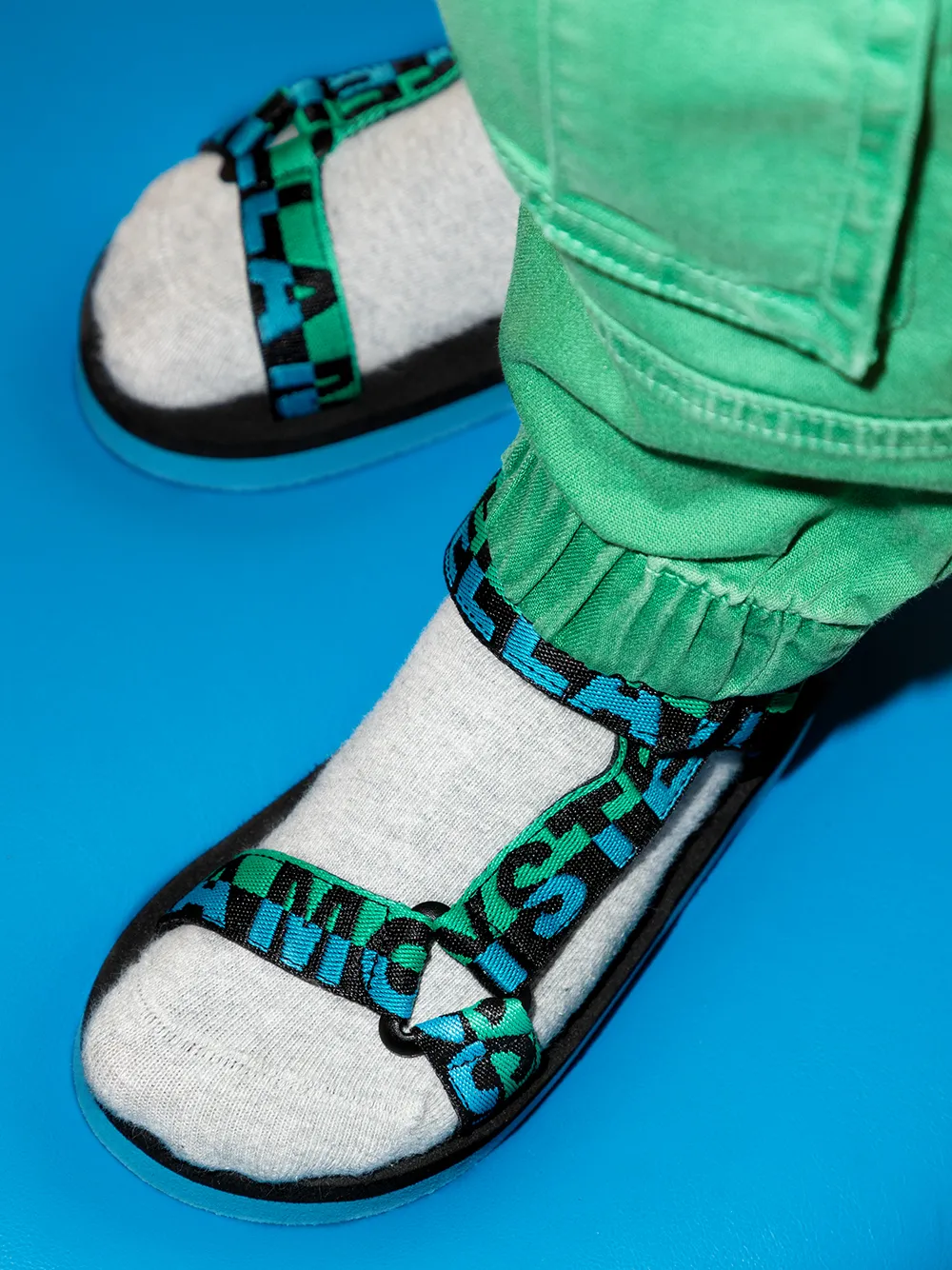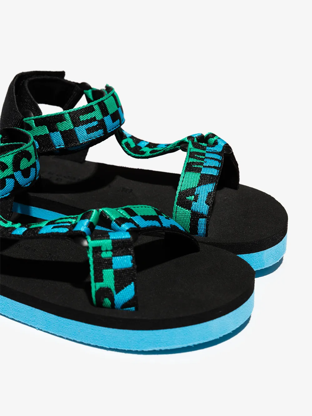 Черный, зеленый, синий, застежка на липучке спереди, ремешки с логотипом, открытый носок и плоская резиновая подошва. .
