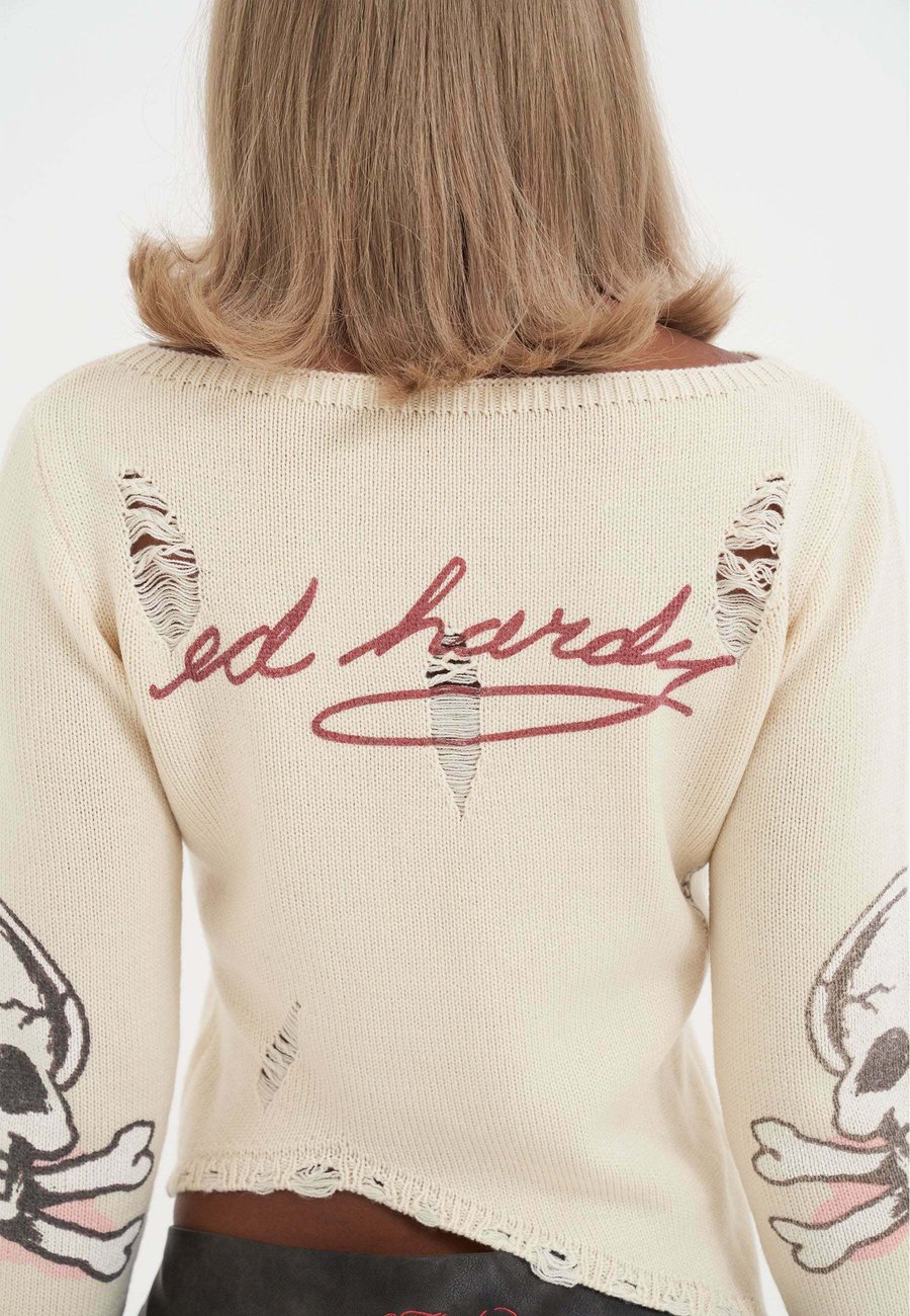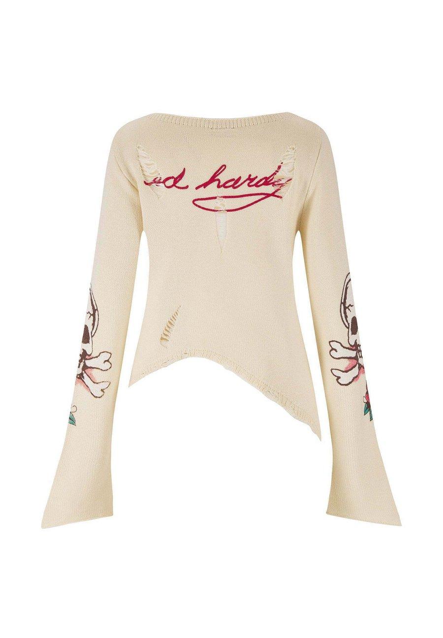 Женский вязаный джемпер с черепом и розами, цвет экрю. Стандартный крой с расклешенными рукавами. Рельефный вырез. Легкий трикотаж. Принт с черепом спереди, на рукавах и логотипе сзади. Симметричный низ. Эффект потертости по низу. 70% акрил, 30% шерсть. Вырез: круглый.Материал и уход