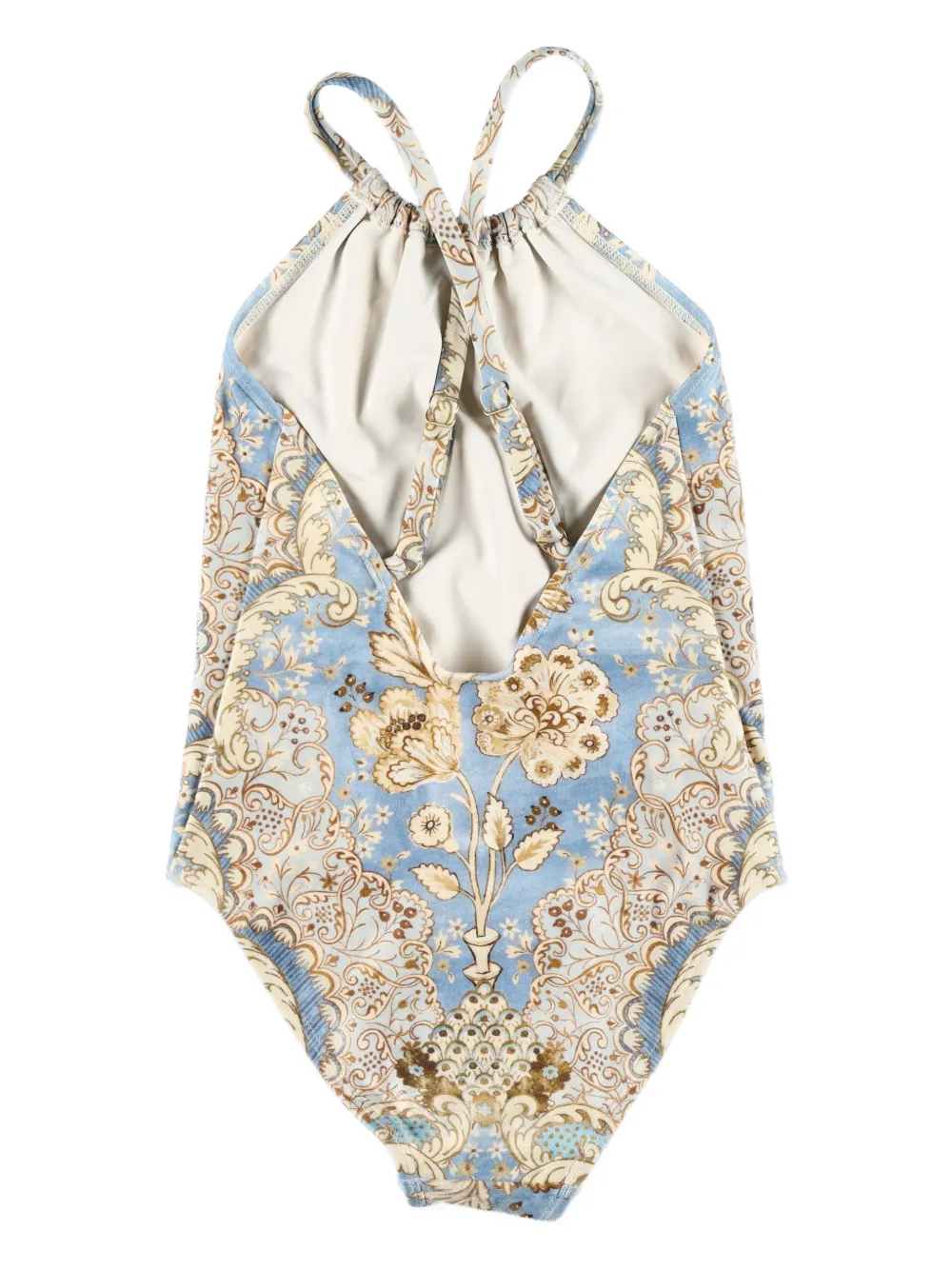 Светло-голубой купальник с цветочным принтом, воротником-халтер, открытой спиной и перекрещивающимися сзади лямками.