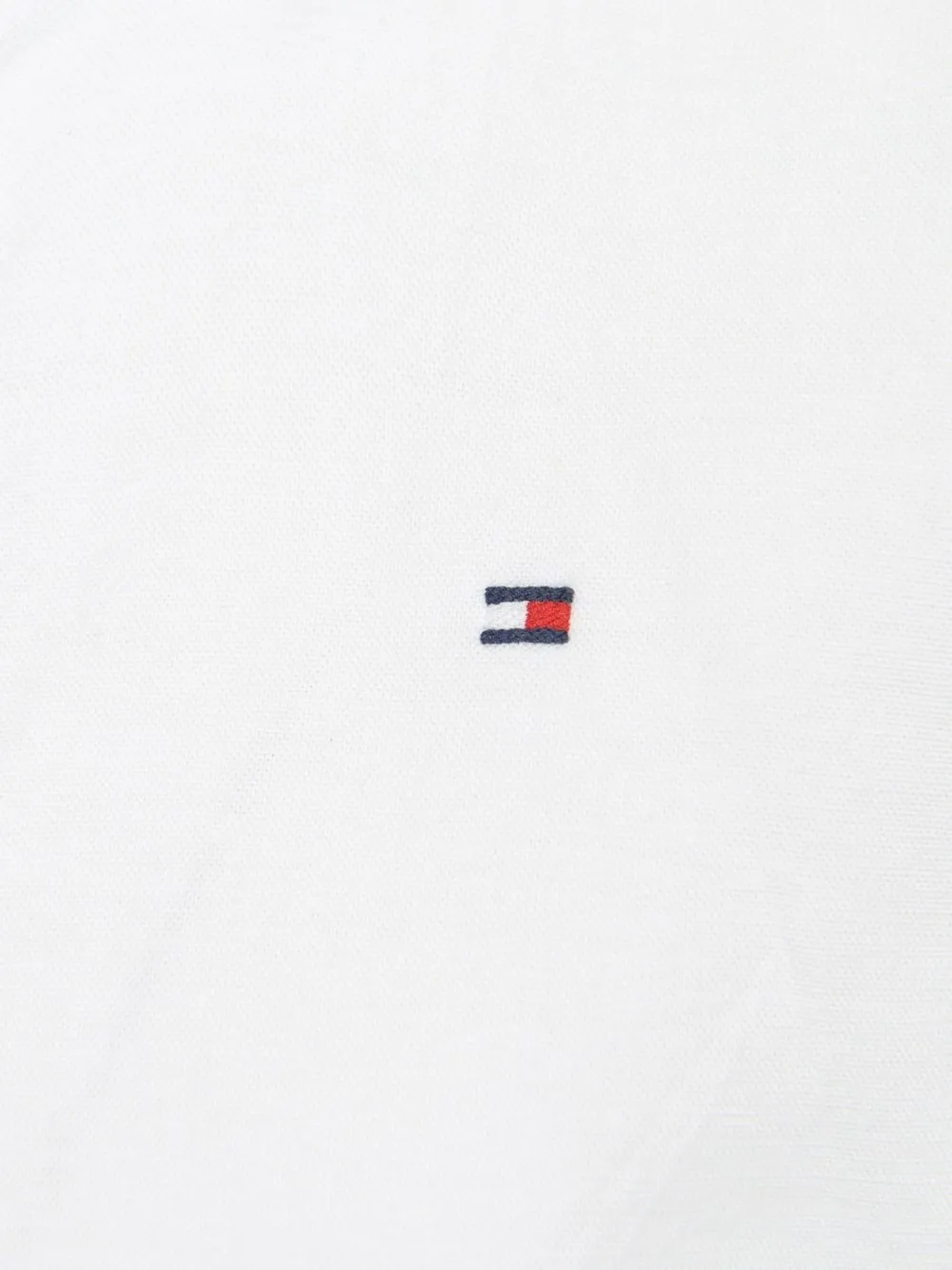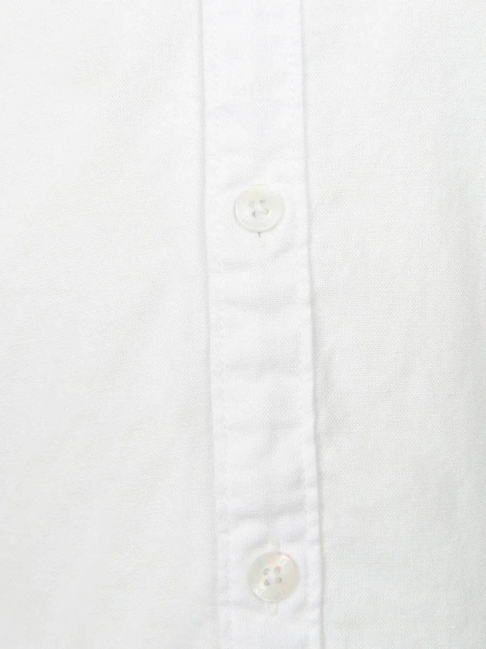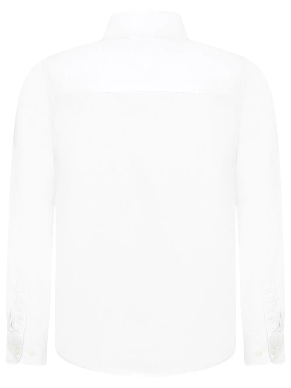 Белый, эластичный хлопок, вышитый логотип на груди, воротник на пуговицах, застежка на пуговицах спереди, рукава с манжетами на пуговицах и закругленный подол.