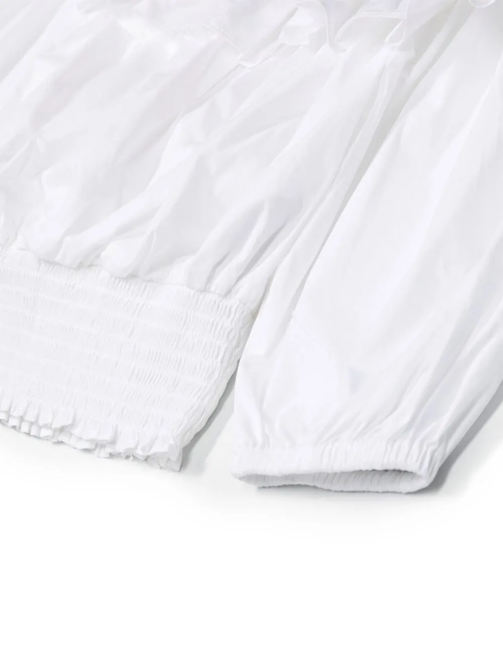Белый, эластичный хлопок, золотистый металлический логотип, открытые плечи, вставки с оборками, эластичный пояс, эластичные манжеты и длинные рукава.