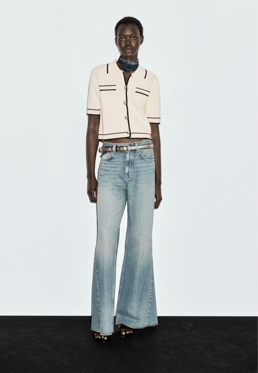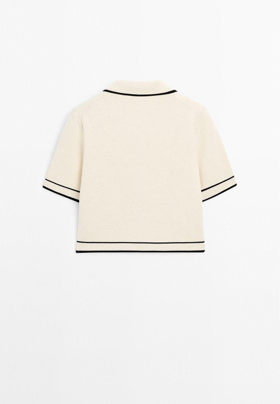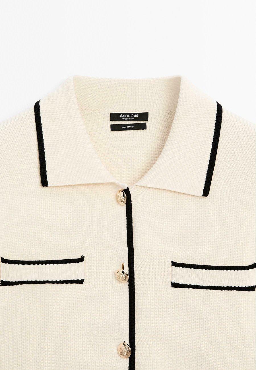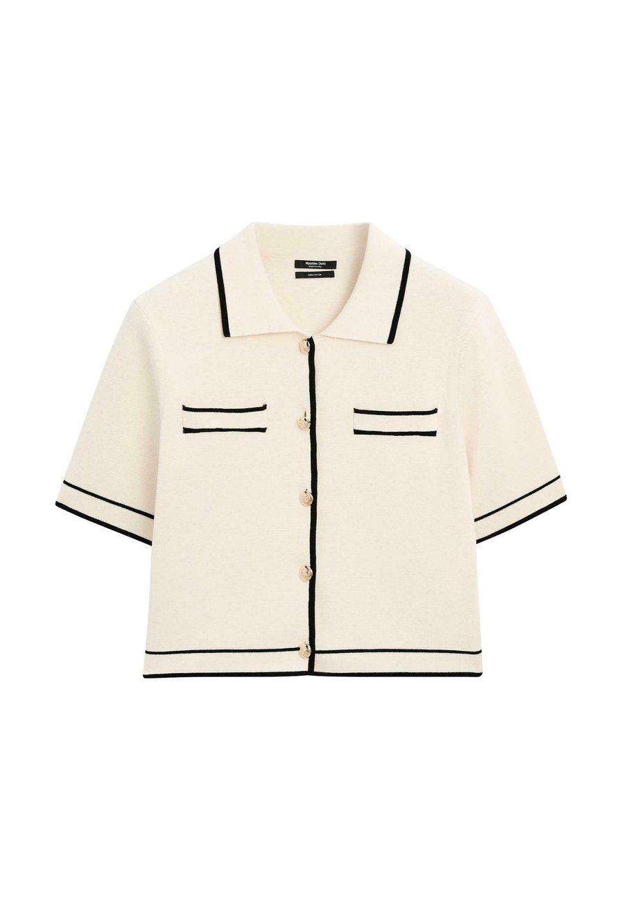 Два накладных кармана на груди. Короткие рукава. Контрастная ткань на воротнике и манжетах. Кардиган из трикотажной ткани, 100% хлопок. Застежка на пуговицы спереди. Воротник: Отложной воротник.Материал и уход