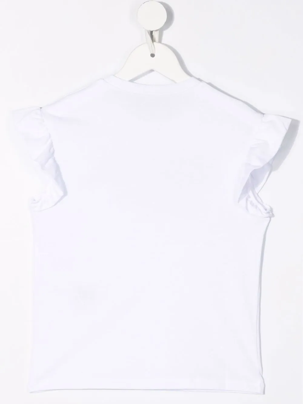 Вставки с оборками, логотип спереди, круглый вырез, без рукавов и прямой подол.
