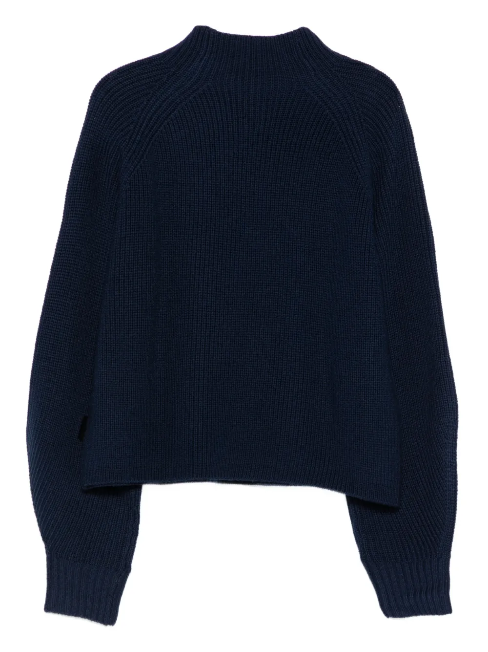 Тёмно-синяя вязаная конструкция, высокий воротник, длинные рукава, ребристый низ и манжеты