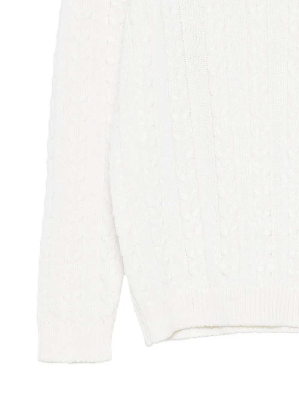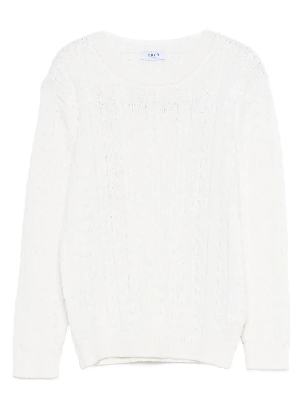 Белый вязаный джемпер с косами, длинными рукавами, круглым вырезом и ребристым низом