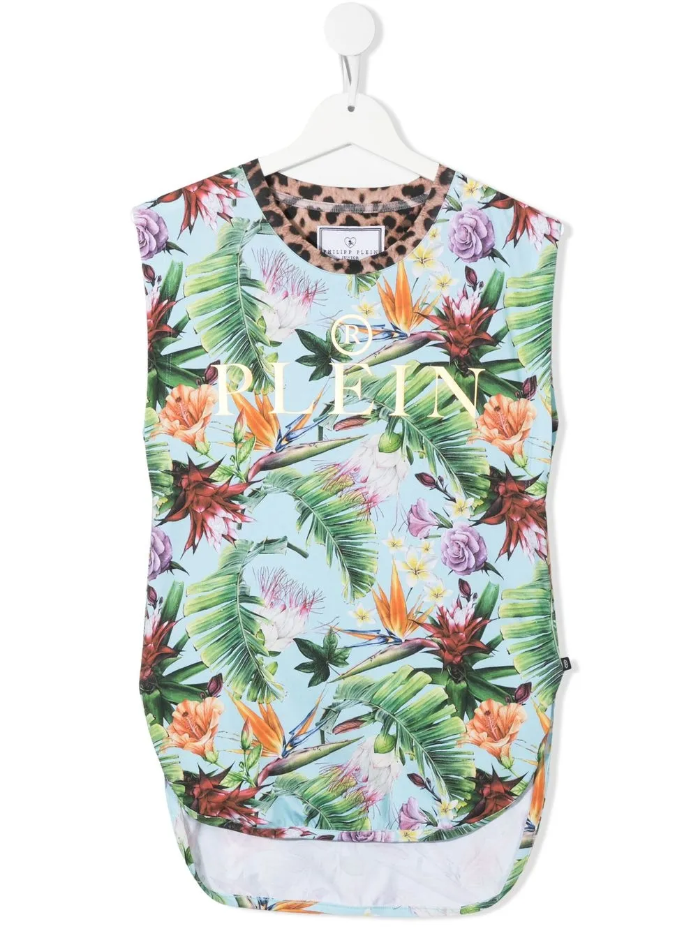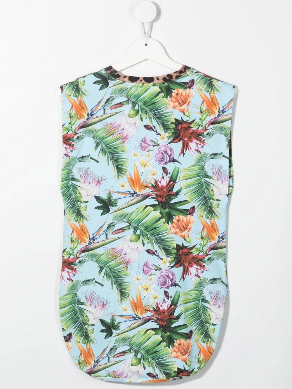 Разноцветный, эластичный хлопок, сплошной цветочный принт, леопардовый принт, логотип спереди, круглый вырез, без рукавов и закругленный подол.