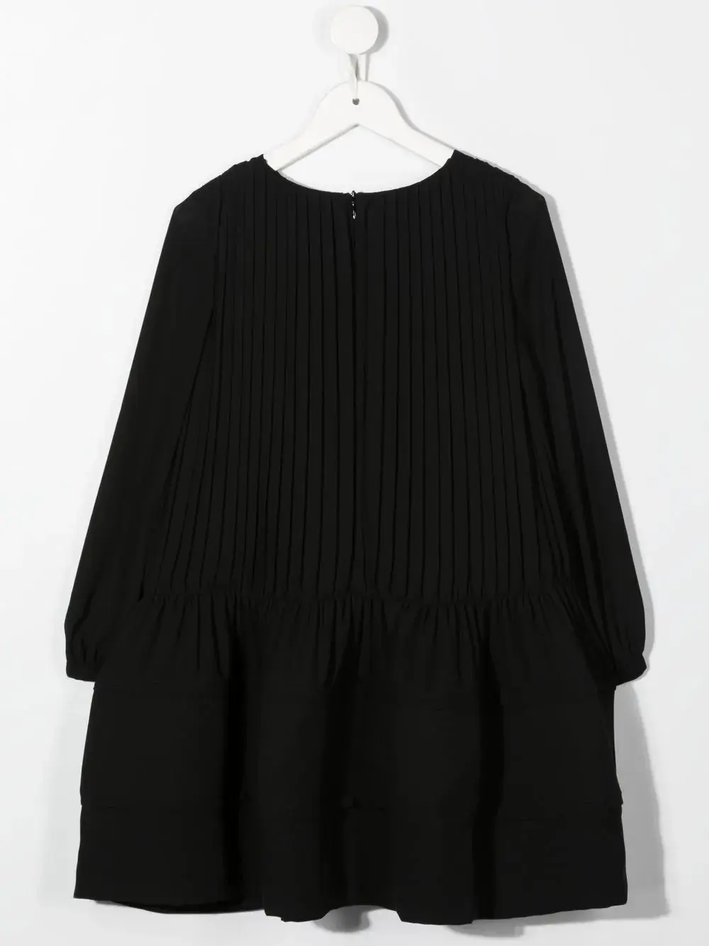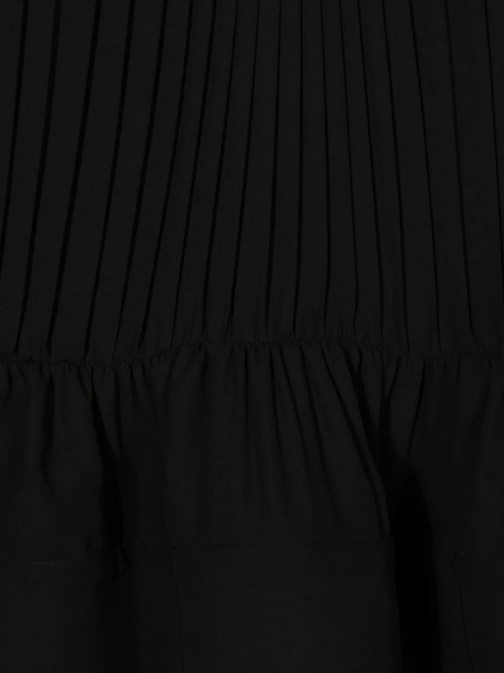 Черный, силуэт трапеция, креповая текстура, складки, круглый вырез, потайная застежка на молнии сзади, длинные рукава и эластичные манжеты.