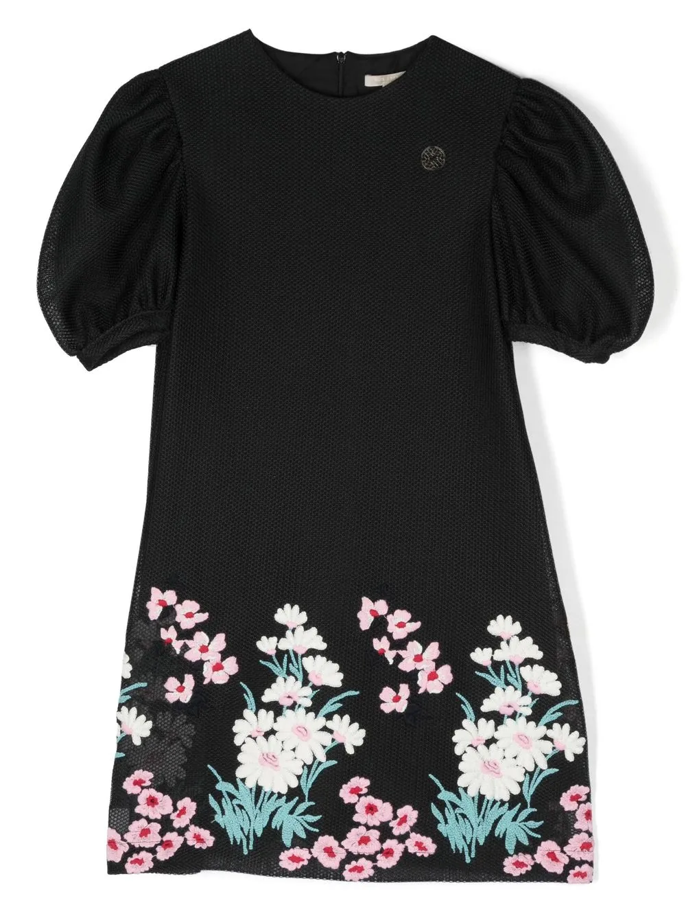 Черный/разноцветный, хлопок, сплошная цветочная вышивка, сетчатые вставки, золотистый металлический логотип, застежка на молнии сзади, короткие объемные рукава и прямой подол.