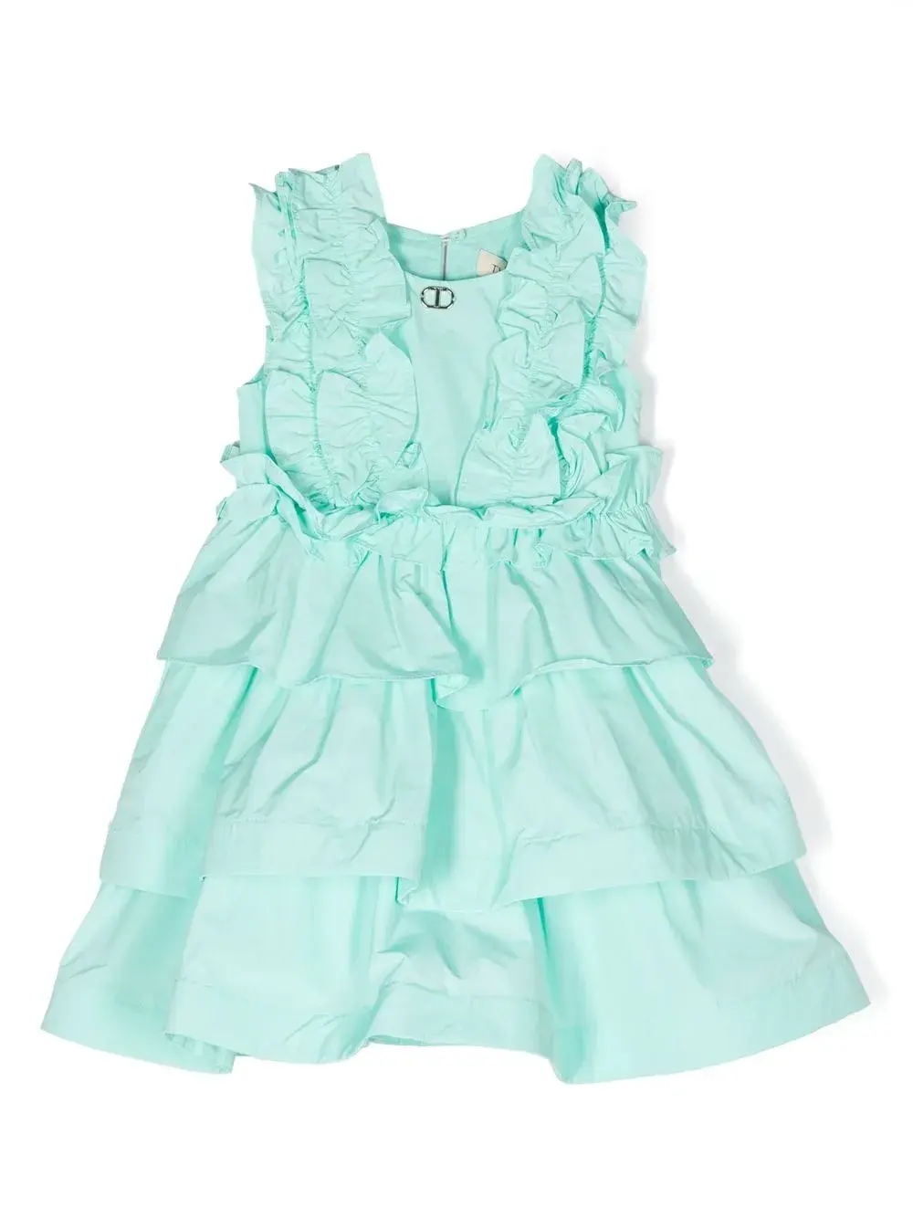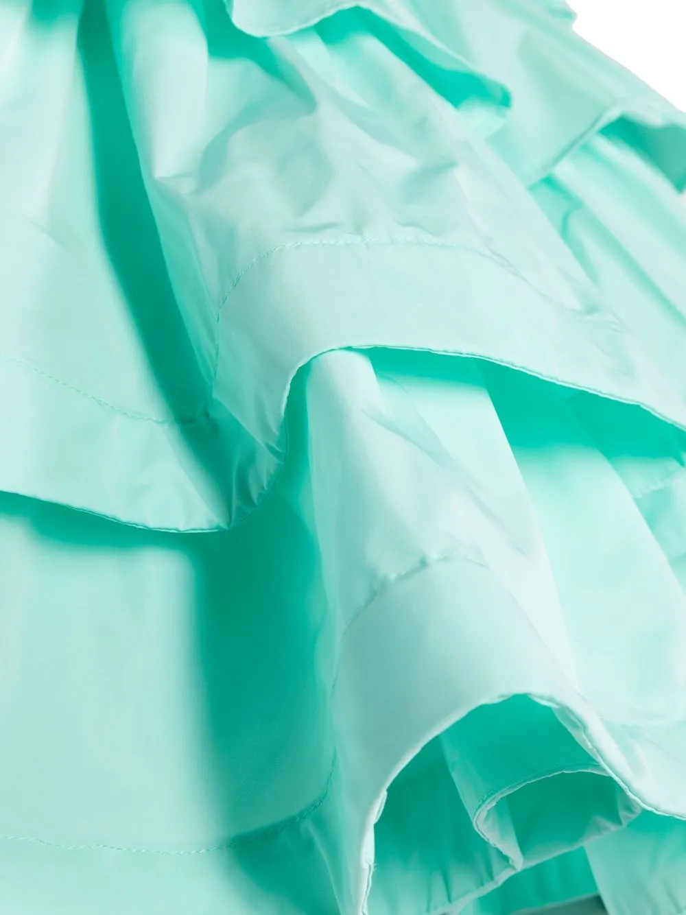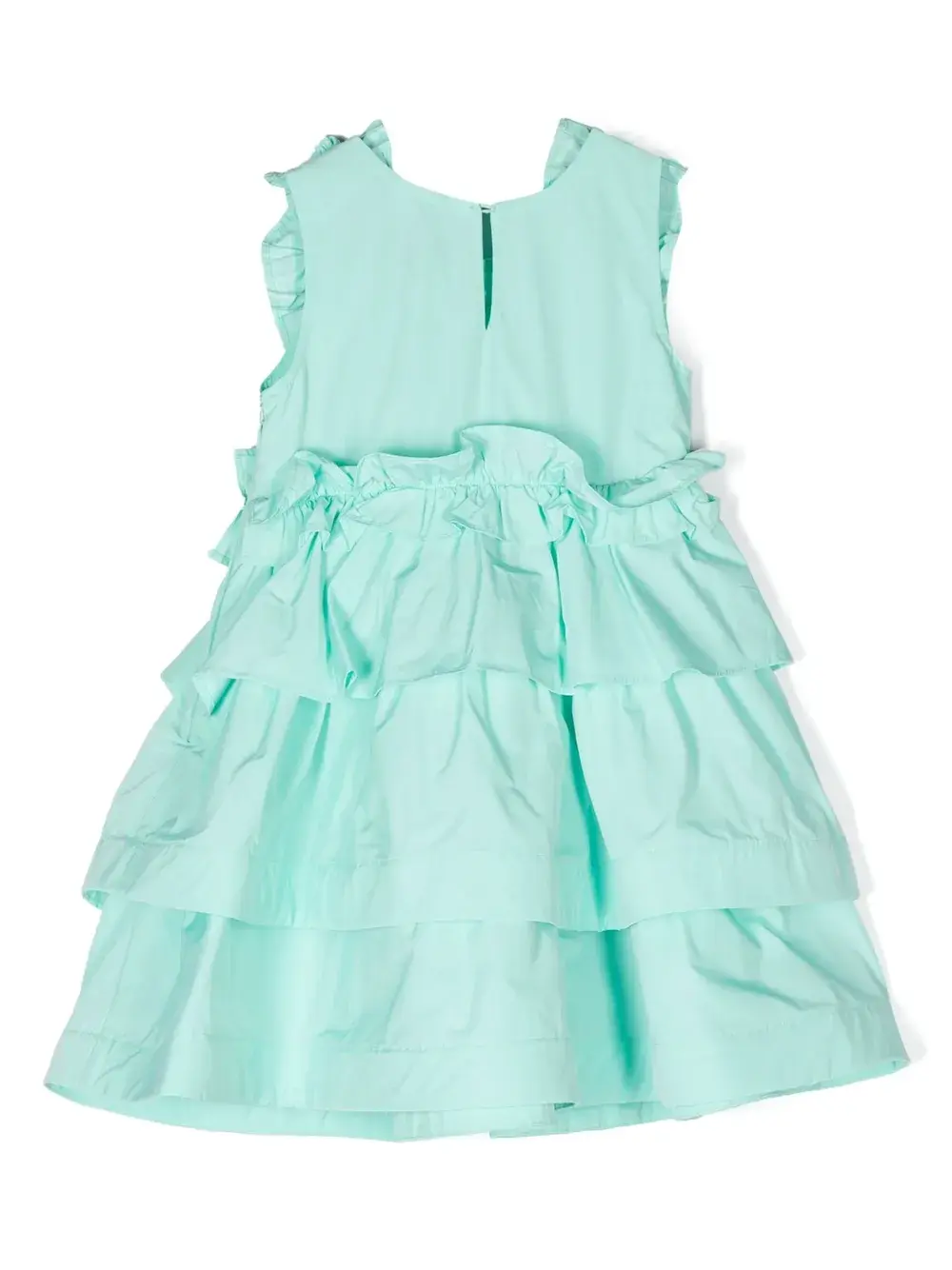 Мятно-зеленый, хлопок, серебристый металлический логотип, модель с оборками, круглый вырез, без рукавов, застежка на пуговицы сзади, вырез сзади и ярусная юбка.