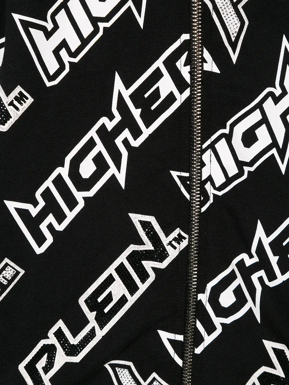Сплошной принт с логотипами, контрастные панели, застежка на молнии спереди, вязаная модель и подол и манжеты в рубчик.