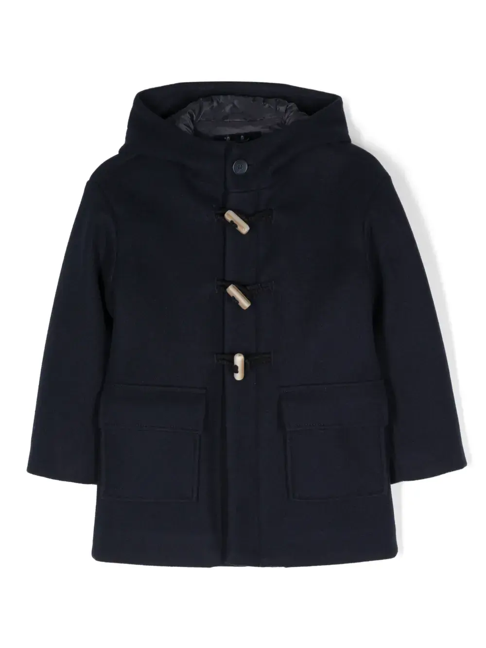 Темно-синий, классический капюшон, высокий воротник, застежка тогл спереди, два передних кармана с клапанами, длинные рукава и прямой подол.