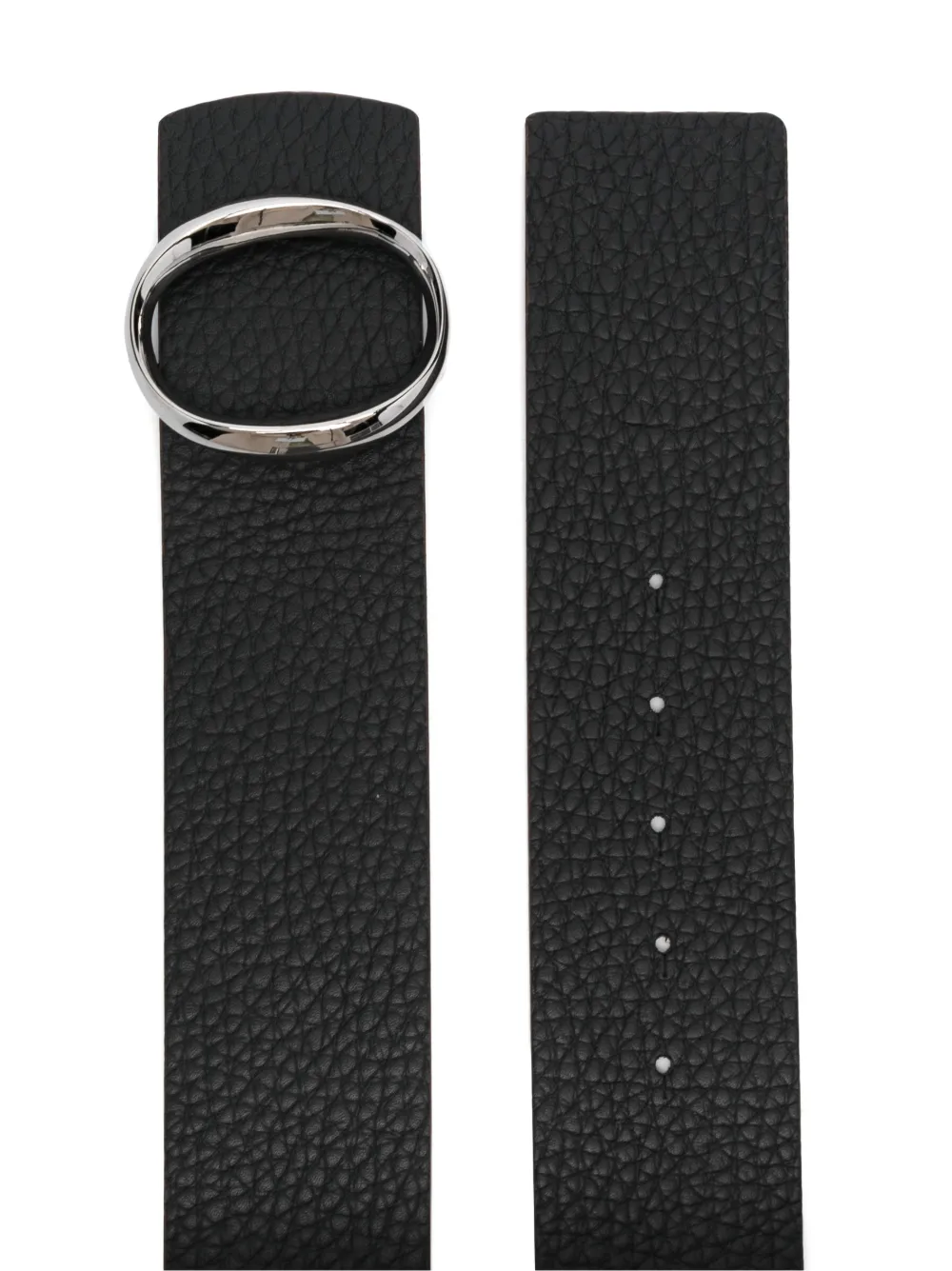 Черный, бежево-коричневый, кожа, зернистая текстура, двусторонний дизайн, застежка на серебристой пряжке, прорезанные отверстия и регулируемый дизайн.