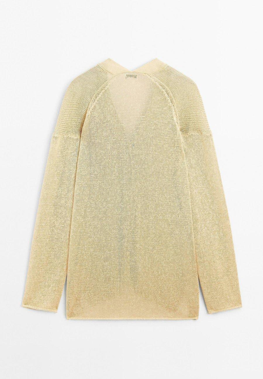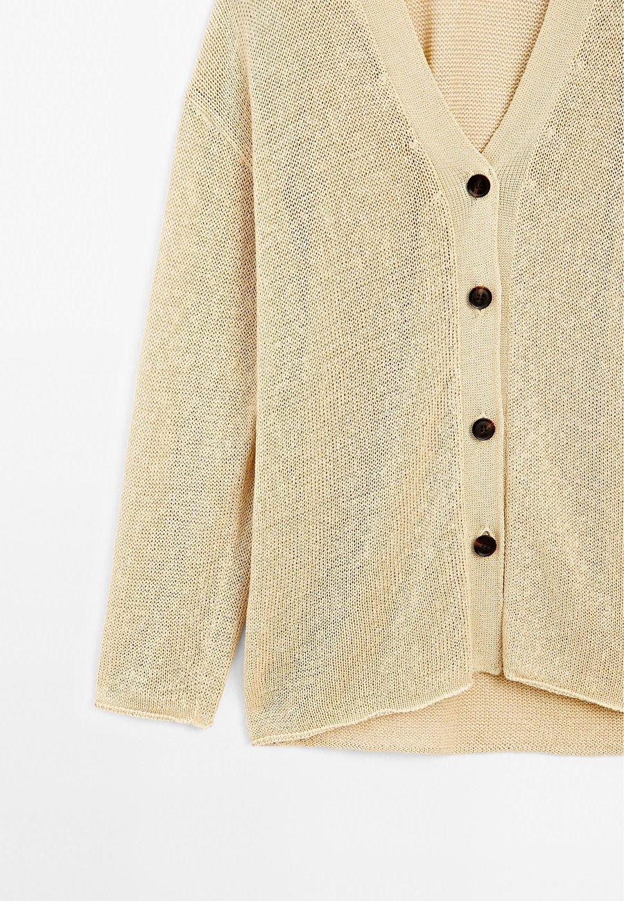 Широкий и свободный силуэт, не приталенный. V-образный вырез. Ребристая отделка. Длинные рукава. Вязаный кардиган из смесовой хлопковой ткани. Тонкая, легкая ткань. Застежка на пуговицы спереди с перламутровой отделкой. Вырез горловины: глубокий V-образный.Материал и уход