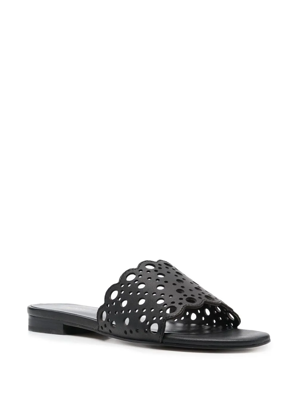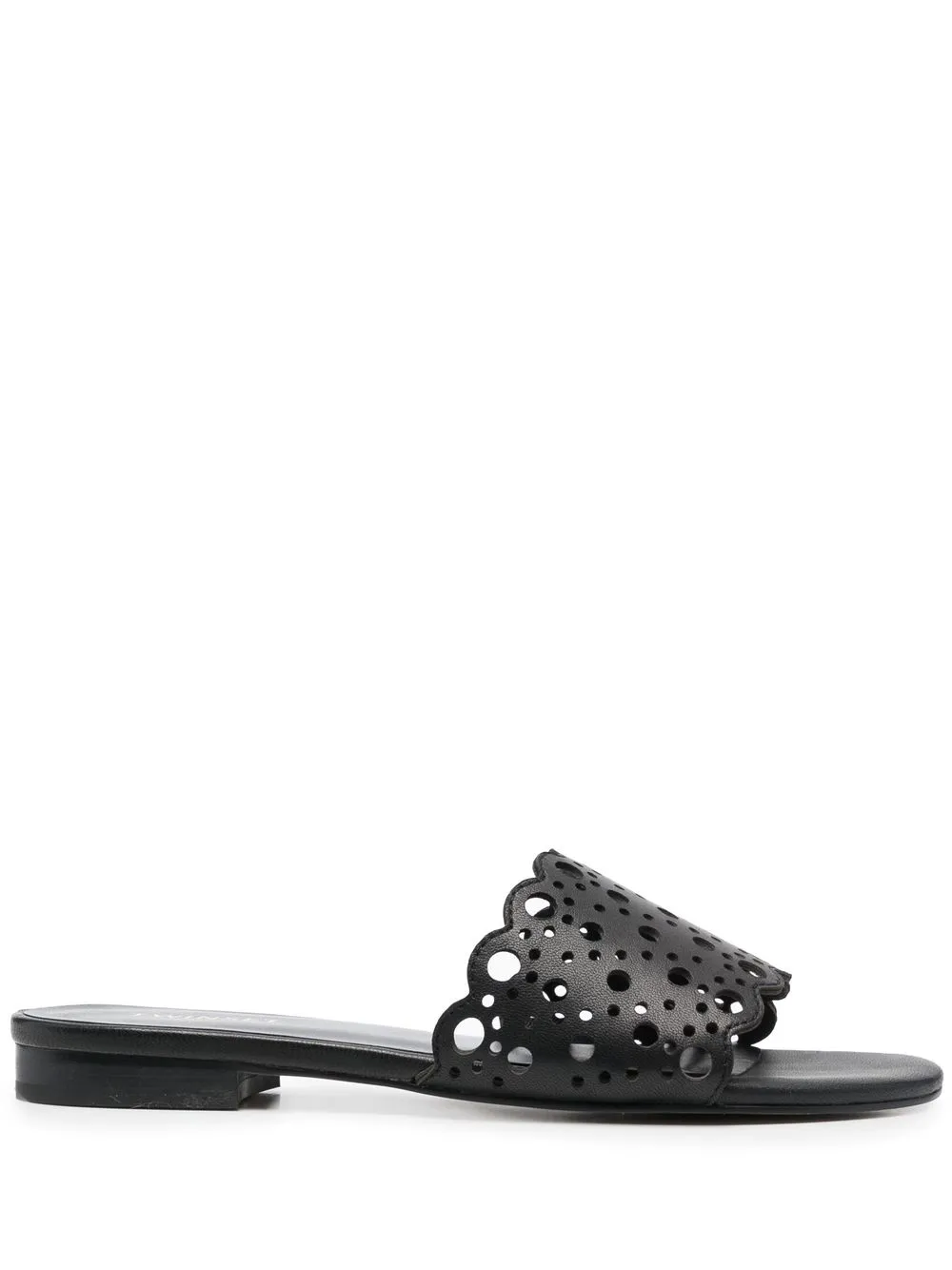 Черный, телячья кожа, перфорация, открытый носок, модель без застежки, кожаная стелька с логотипом и плоская подошва.