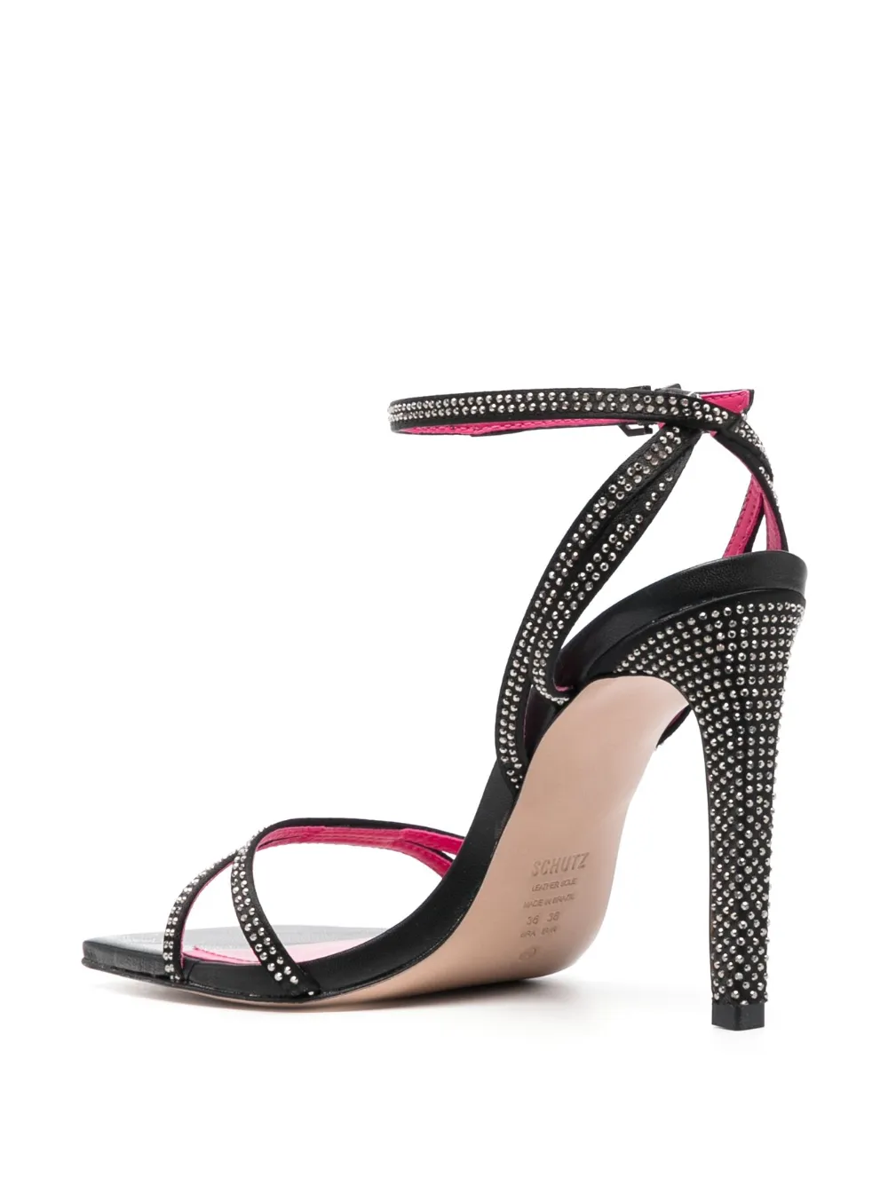 Черный, телячья кожа, декор из кристаллов, ремешок на щиколотке с пряжкой, открытый носок, высокий каблук и кожаная стелька с логотипом.