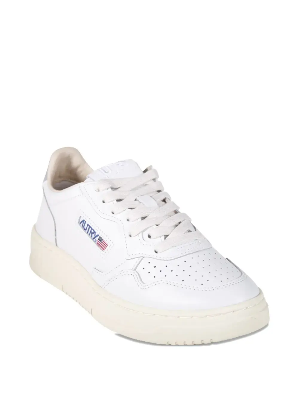 Белая перфорированная носочная часть, передняя шнуровка, логотип бренда, плоская подошва