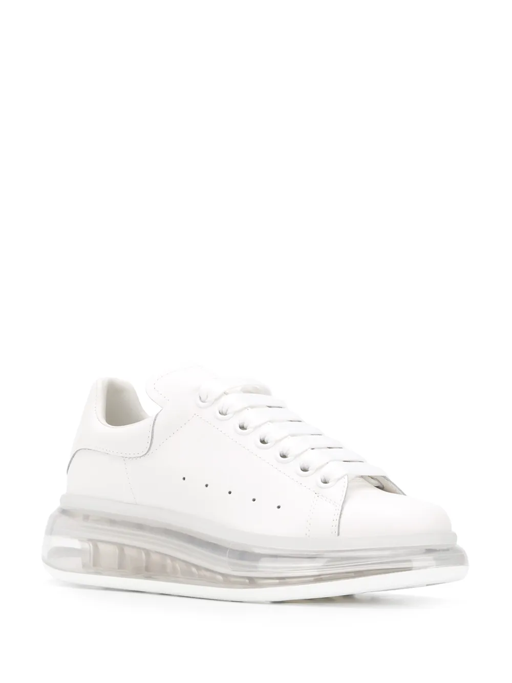 Александр Маккуин начал свою карьеру в 16 лет в ателье на Сэвил-роу, основав собственный бренд в 1992 году. Коллекция весна-лето 2020 создана под руководством креативного директора Сары Бертон. В нее вошли белые кожаные кроссовки Oversized от Alexander McQueen (Александр Маккуин). Язычок с логотипом, закругленный носок, перфорированная деталь, массивная прозрачная подошва и тисненый логотип на заднике. Сделано в Италии.