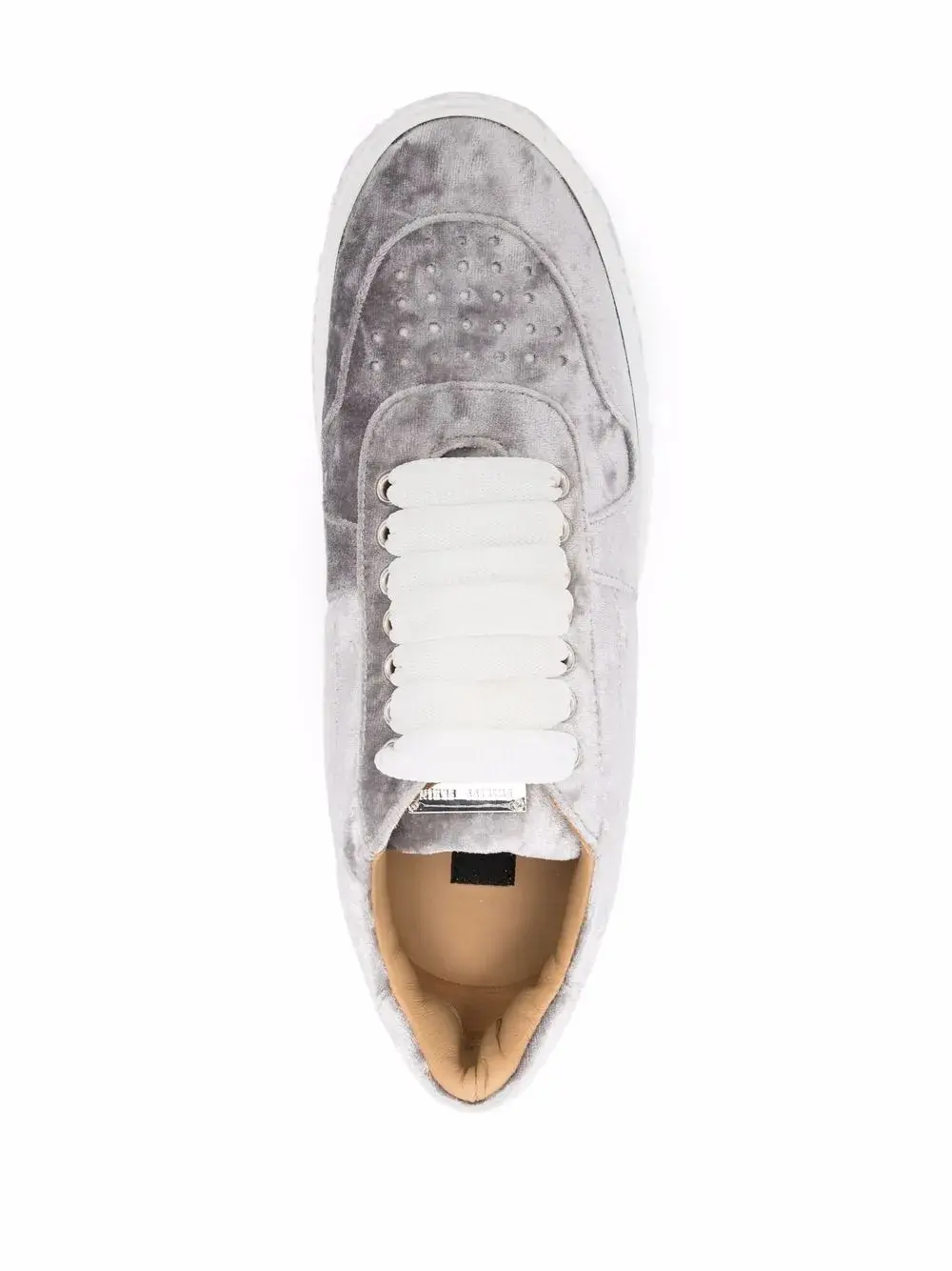 Бархатный эффект, логотип на подошве, перфорация, металлический логотип на язычке, закругленный носок, шнуровка спереди и стелька с логотипом.