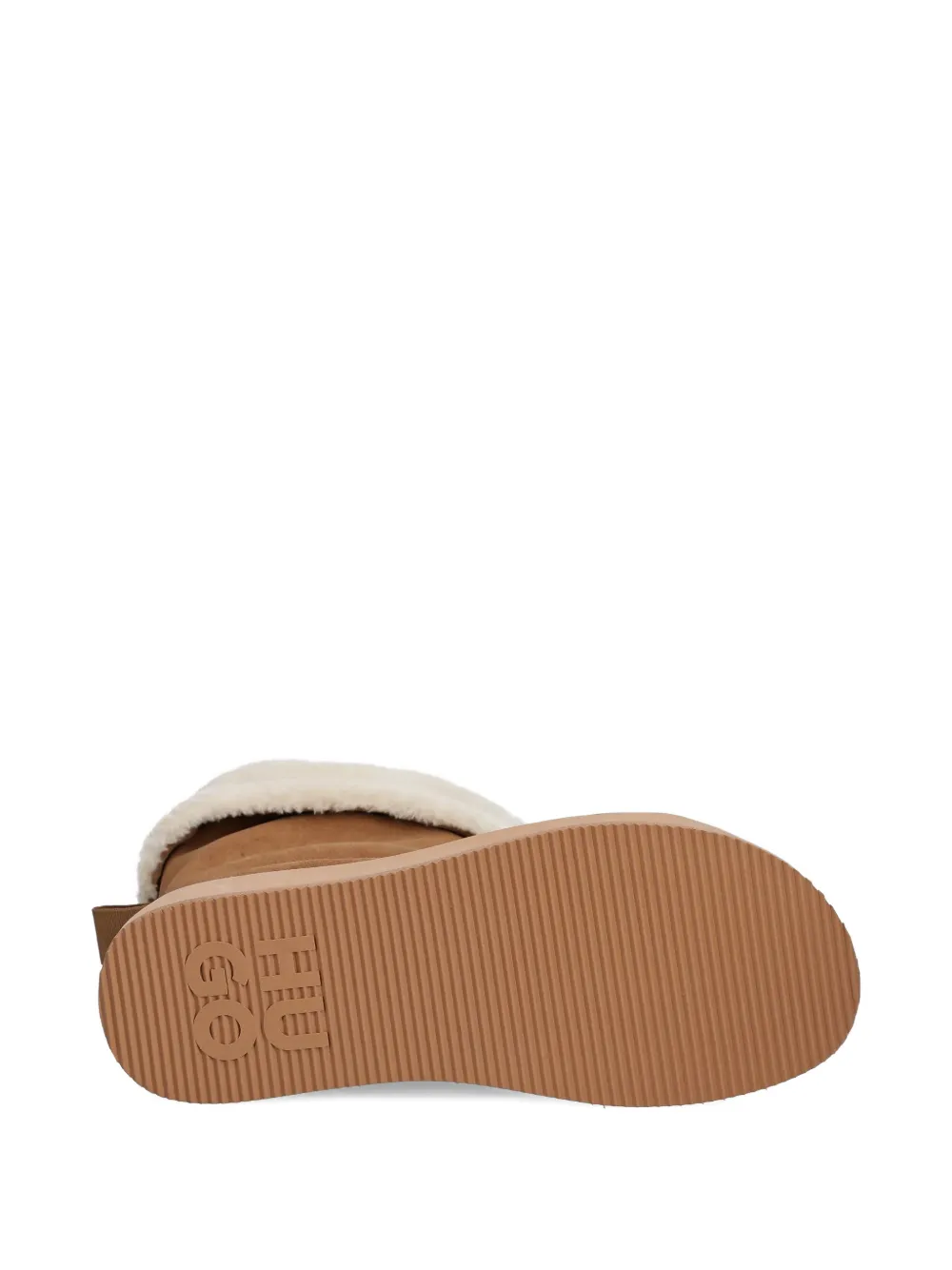 Светло-коричневый цвет, отделка из пушистого материала, плоская подошва, логотип, петля сзади, высота до щиколотки