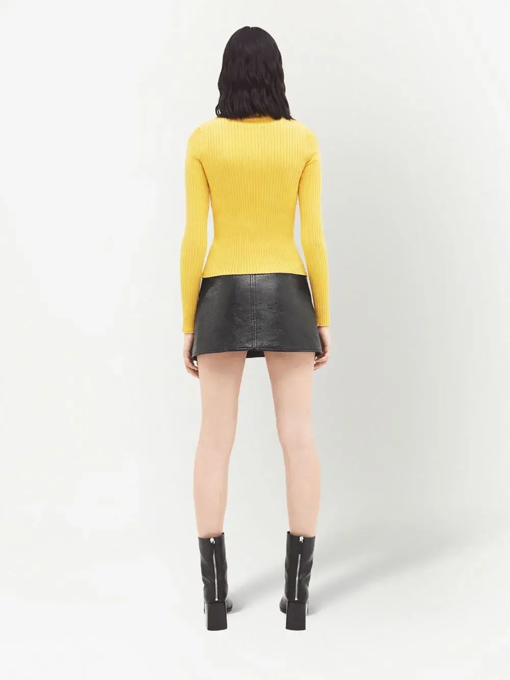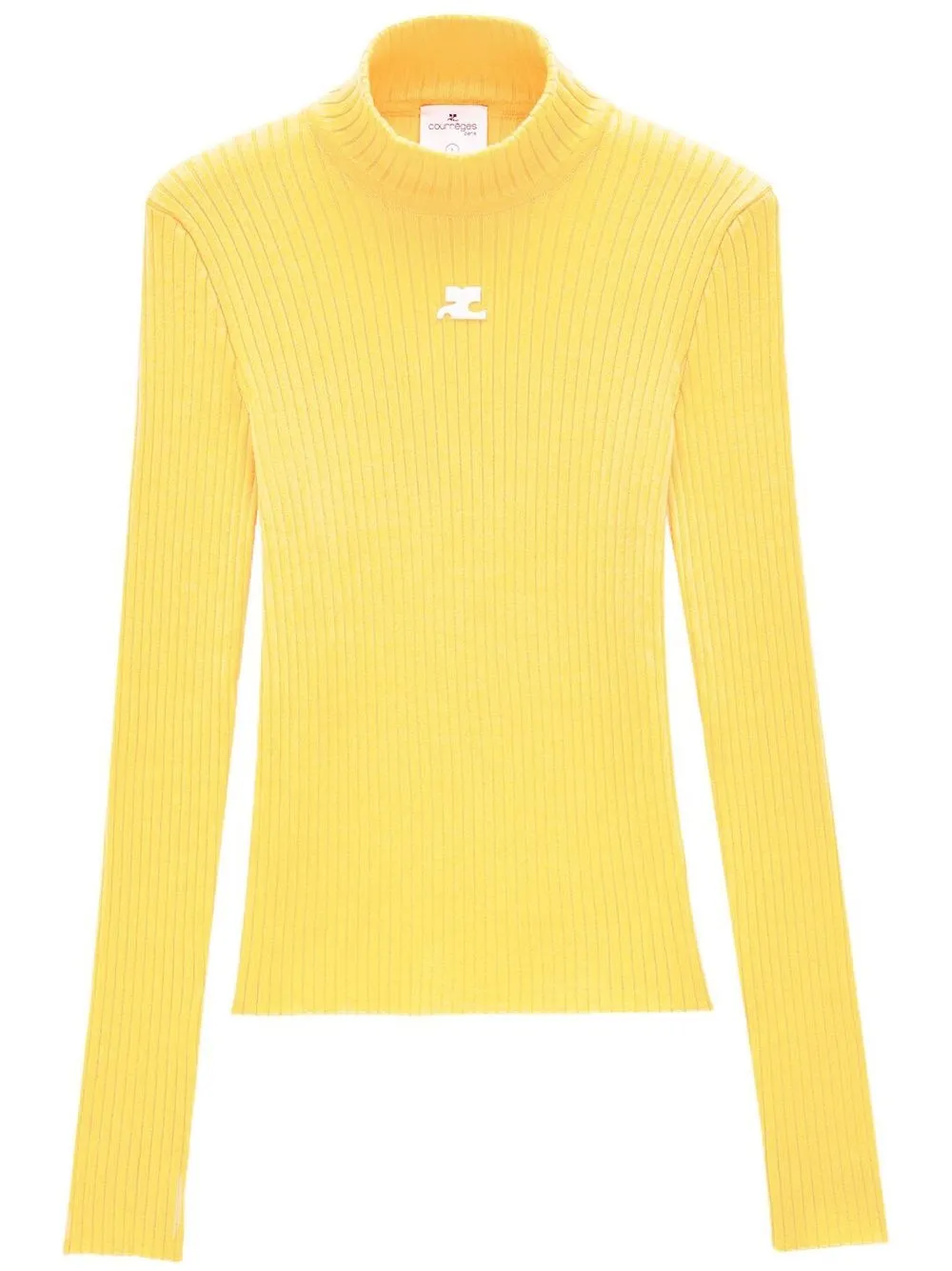 Ярко-желтый, смесовый хлопок, трикотаж в рубчик, нашивка с логотипом спереди, высокий воротник, длинные рукава и прямой подол.