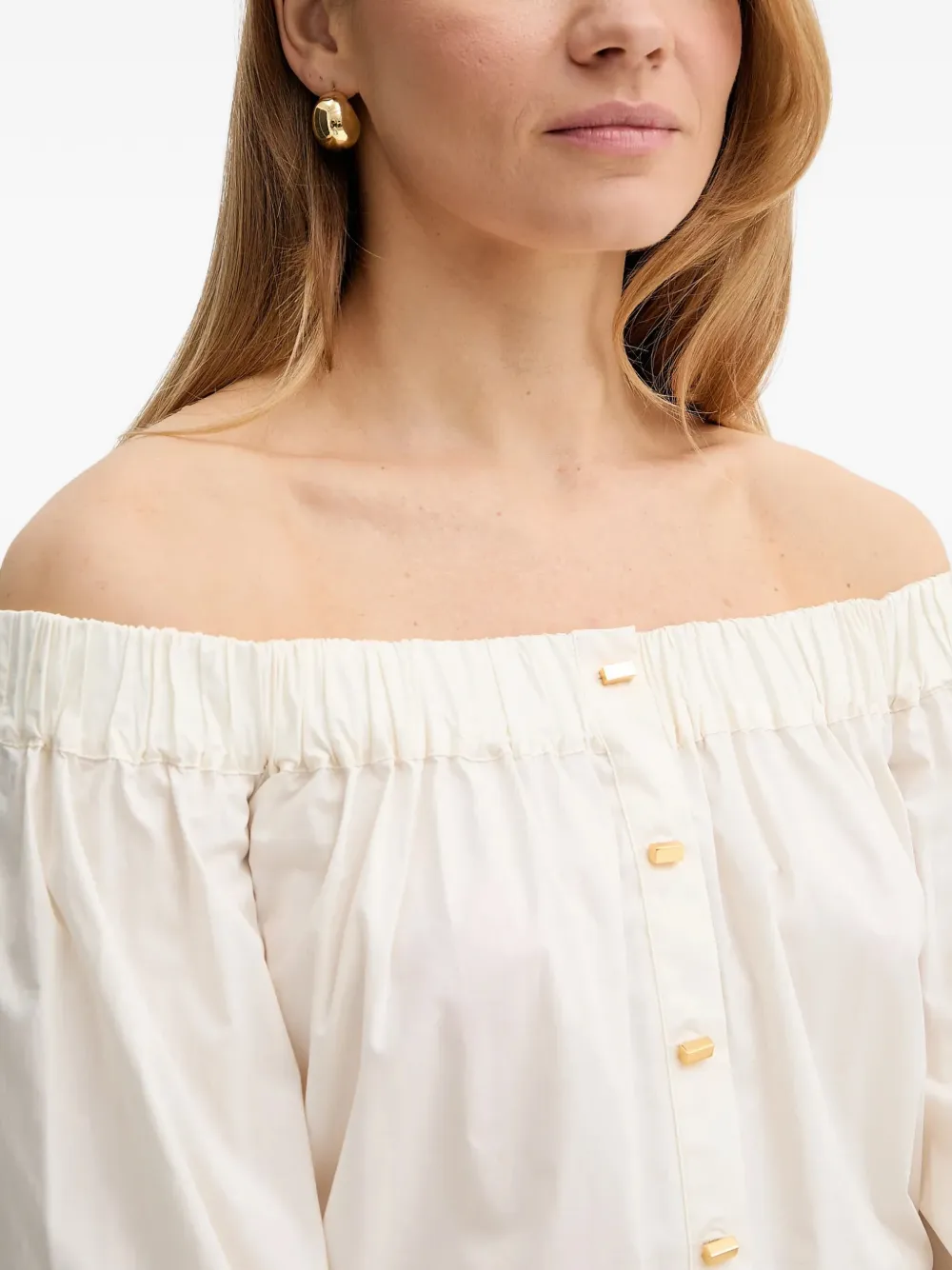 Белый топ с открытыми плечами, украшением в виде пуговиц, фурнитурой золотистого оттенка, эластичной отделкой и рукавами три четверти