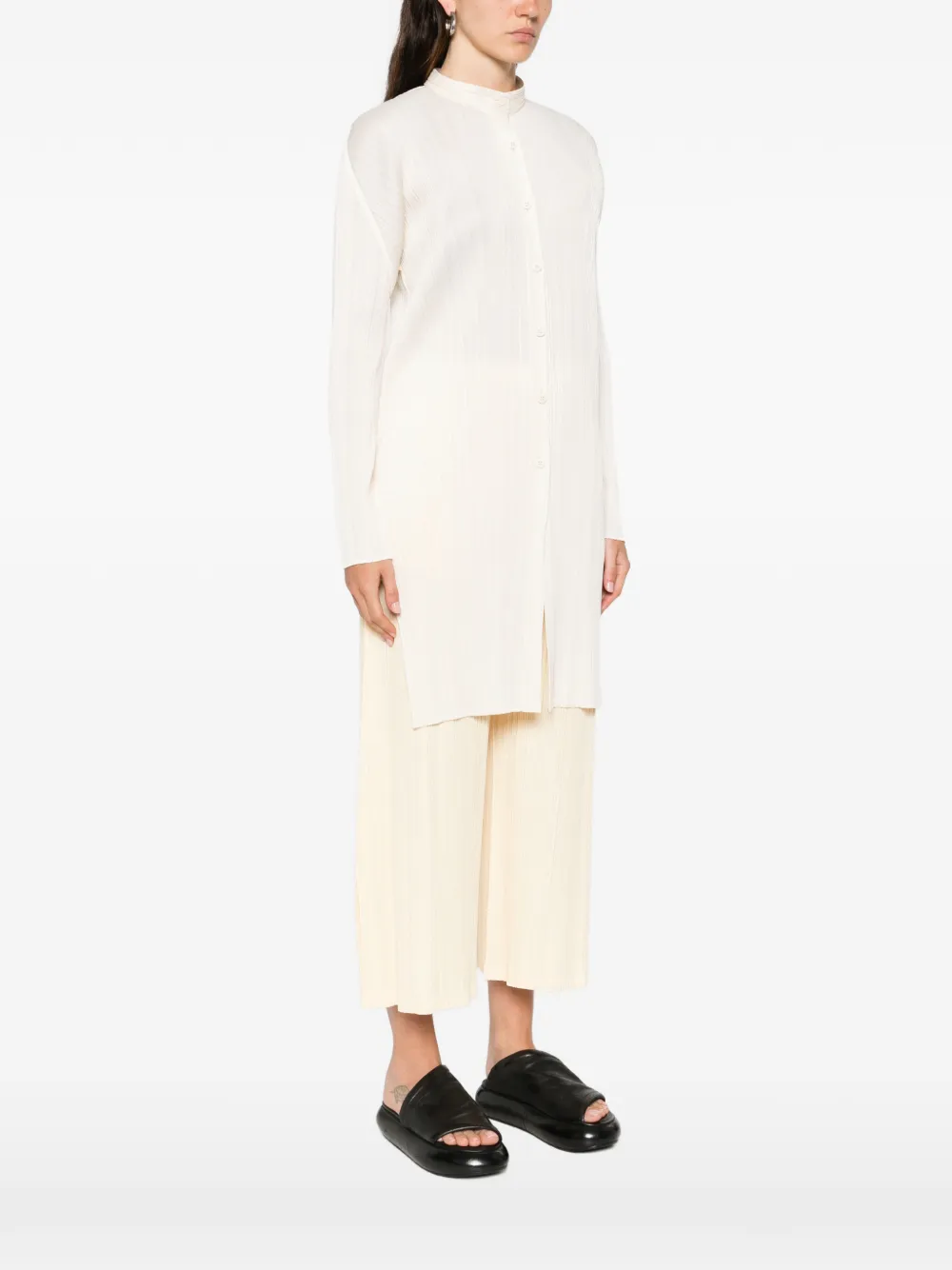 Белая с плиссированной текстурой, застежкой на пуговицы, длинными рукавами и воротником-стойкой