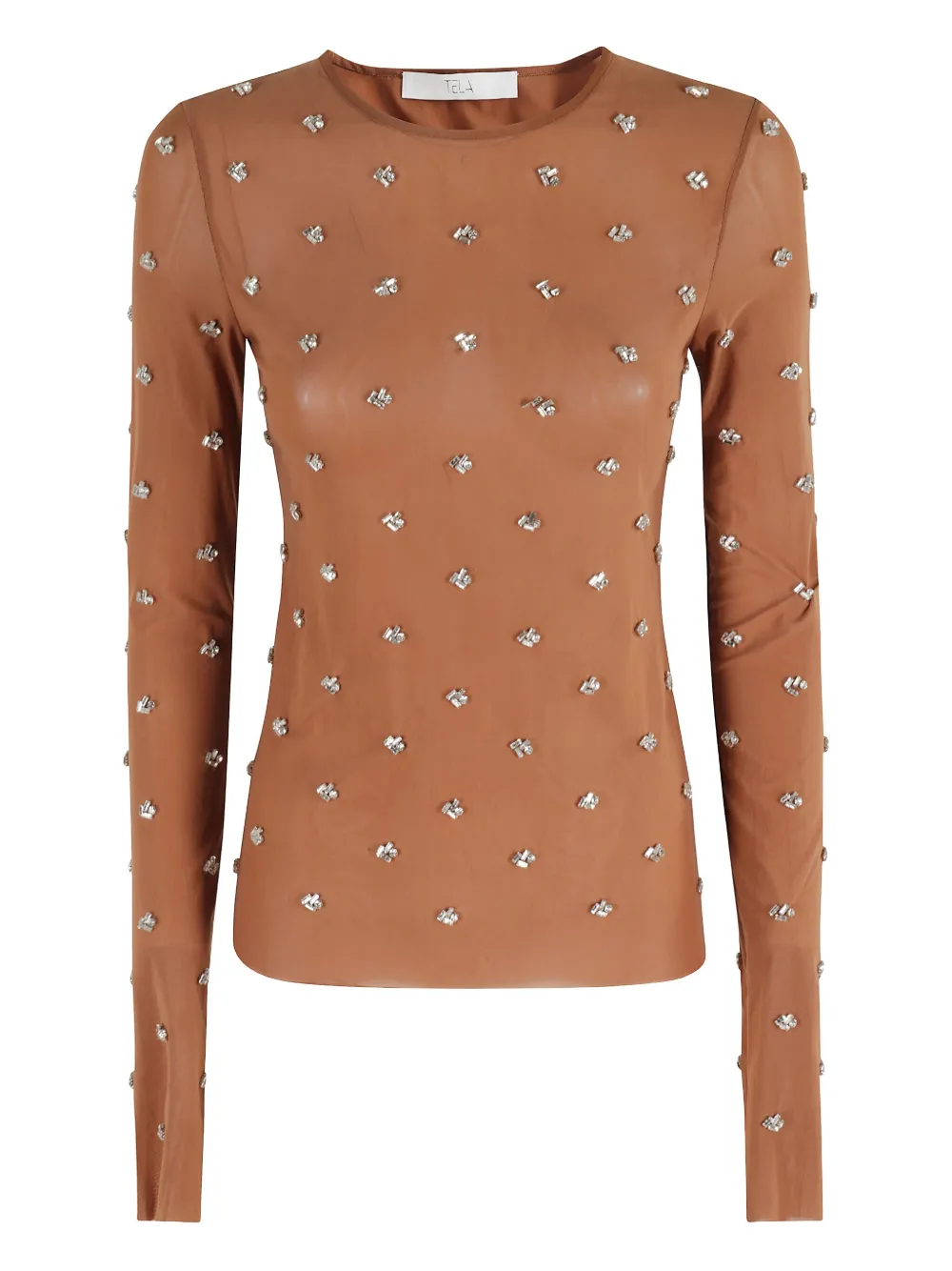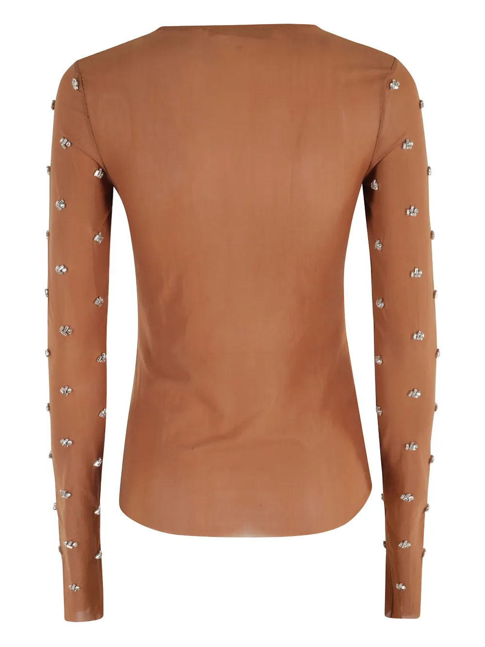 Коричневый топ с украшениями из кристаллов, круглым вырезом и длинными рукавами