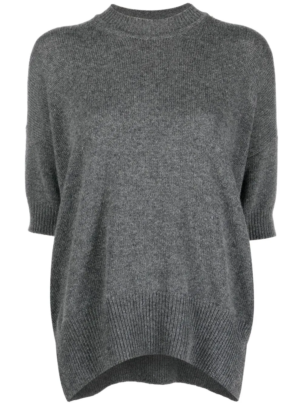 Шиферно-серый, кашемир, трикотажный материал, вязаные края в рубчик, круглый вырез, короткие рукава и прямой подол.