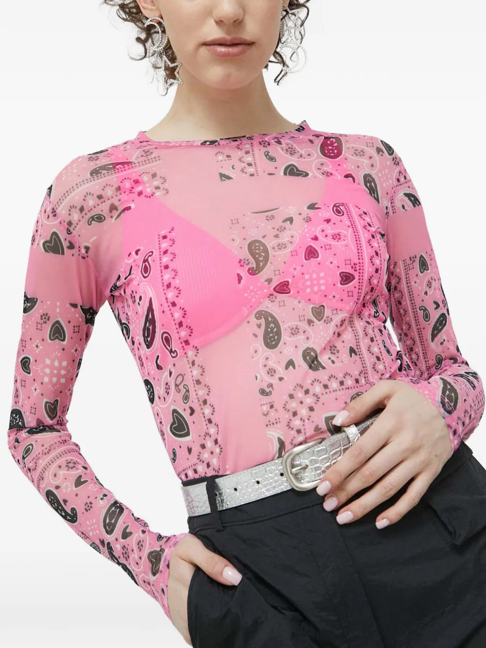 Розовый лонгслив с узором "пейсли", круглым вырезом и сетчатым дизайном