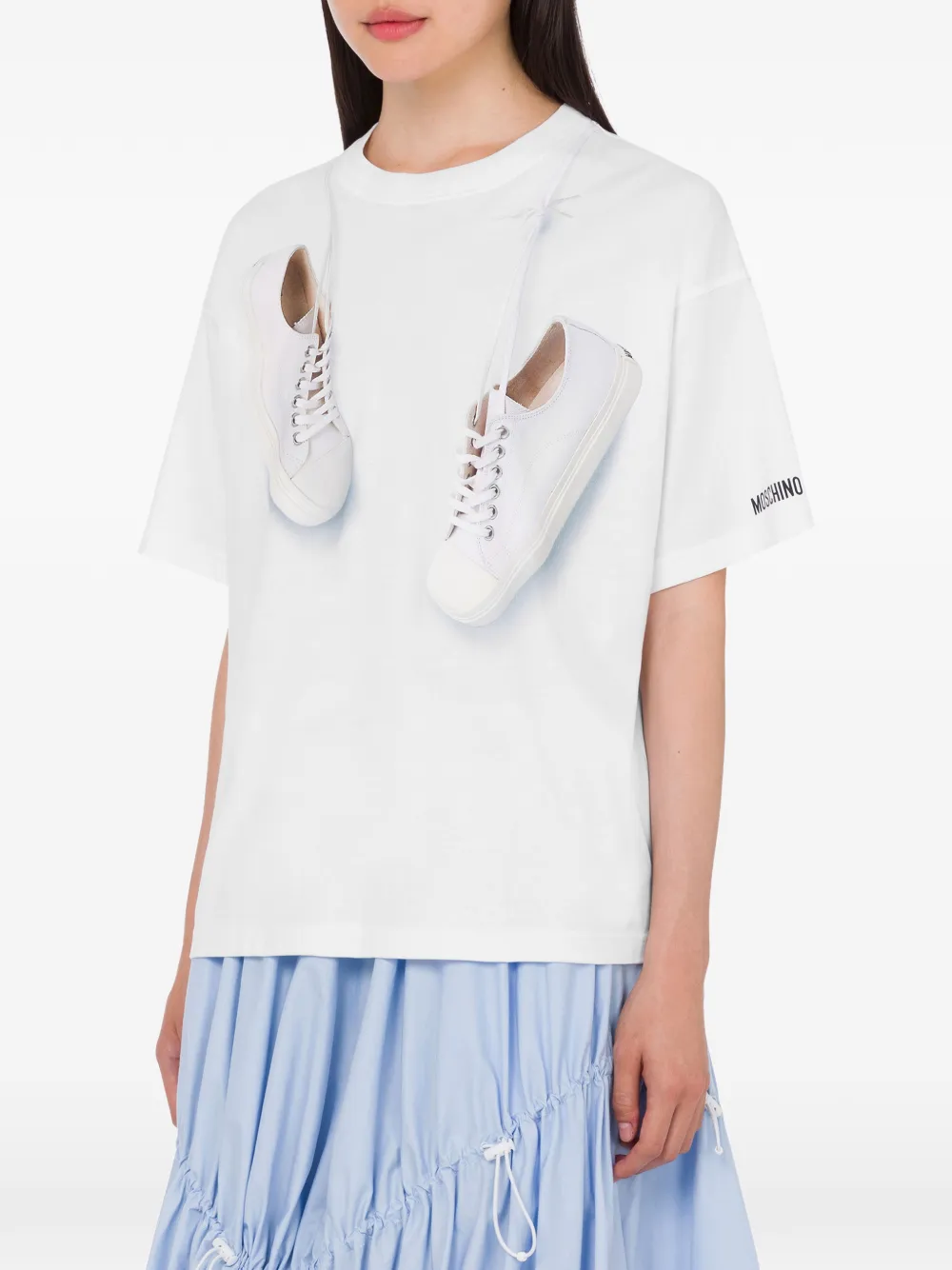 Белая футболка с принтом в виде обуви, круглым вырезом и короткими рукавами